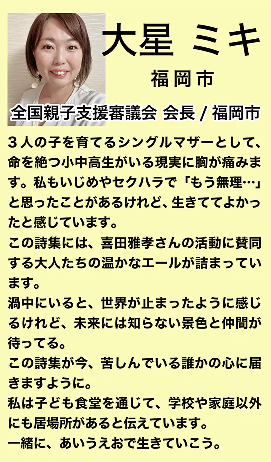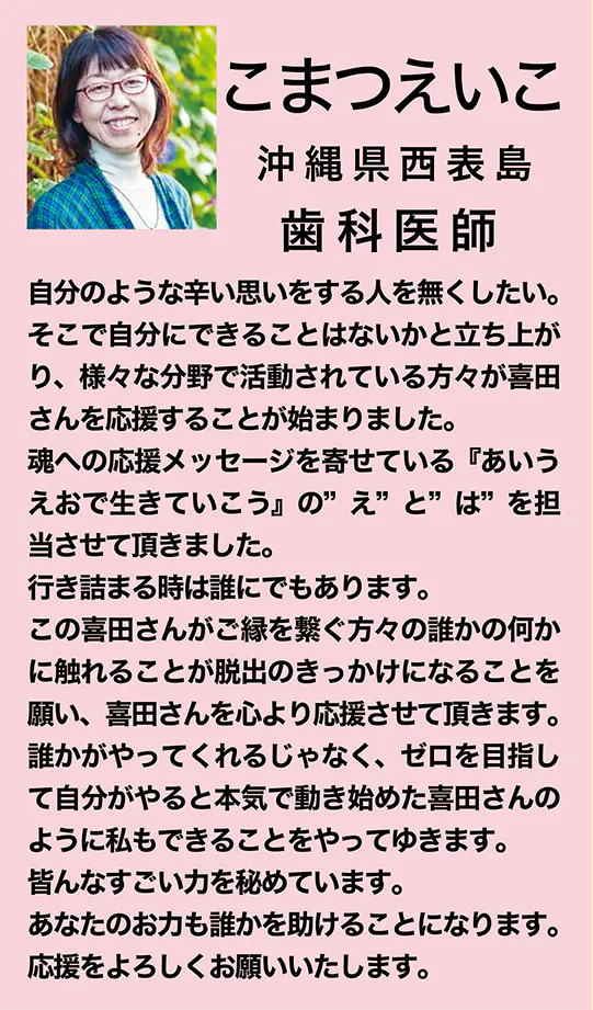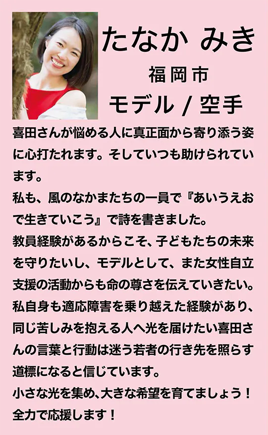 喜田さんの行動力、大切な想いに感動しました!一人でも多くの若者が救われるきっかけとなりますように。応援しています。