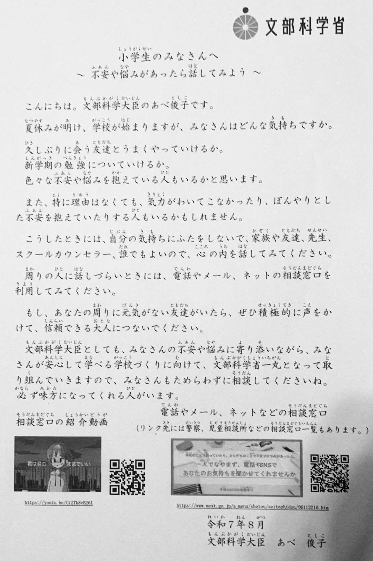 文部科学省から子ども達へのお手紙風のなかまたち@福岡心理カウンセラー山崎小巻先生からの情報です。