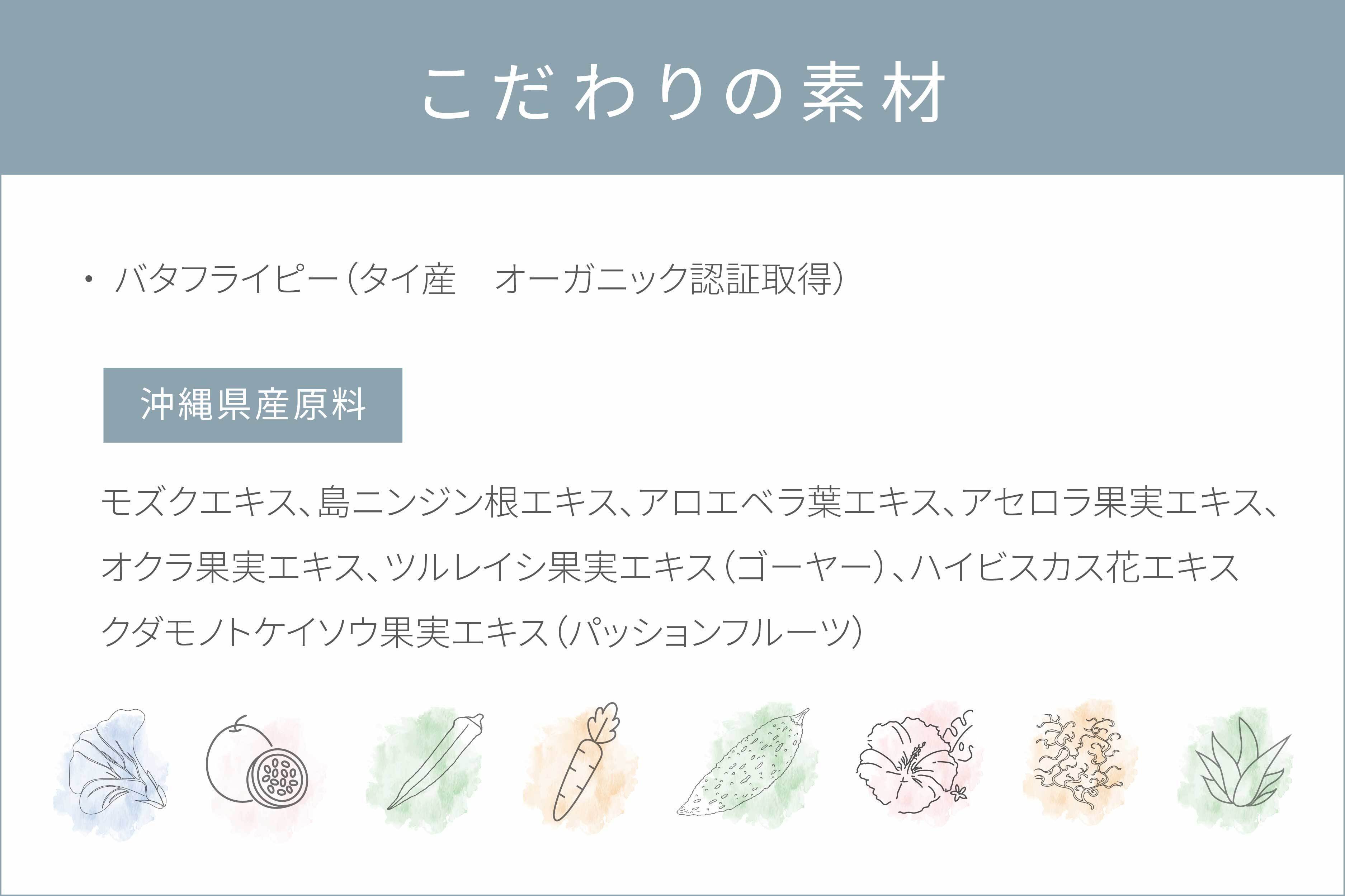 モズクエキス、島ニンジン根エキス、アロエベラ葉エキス、アセロラ果実エキス、