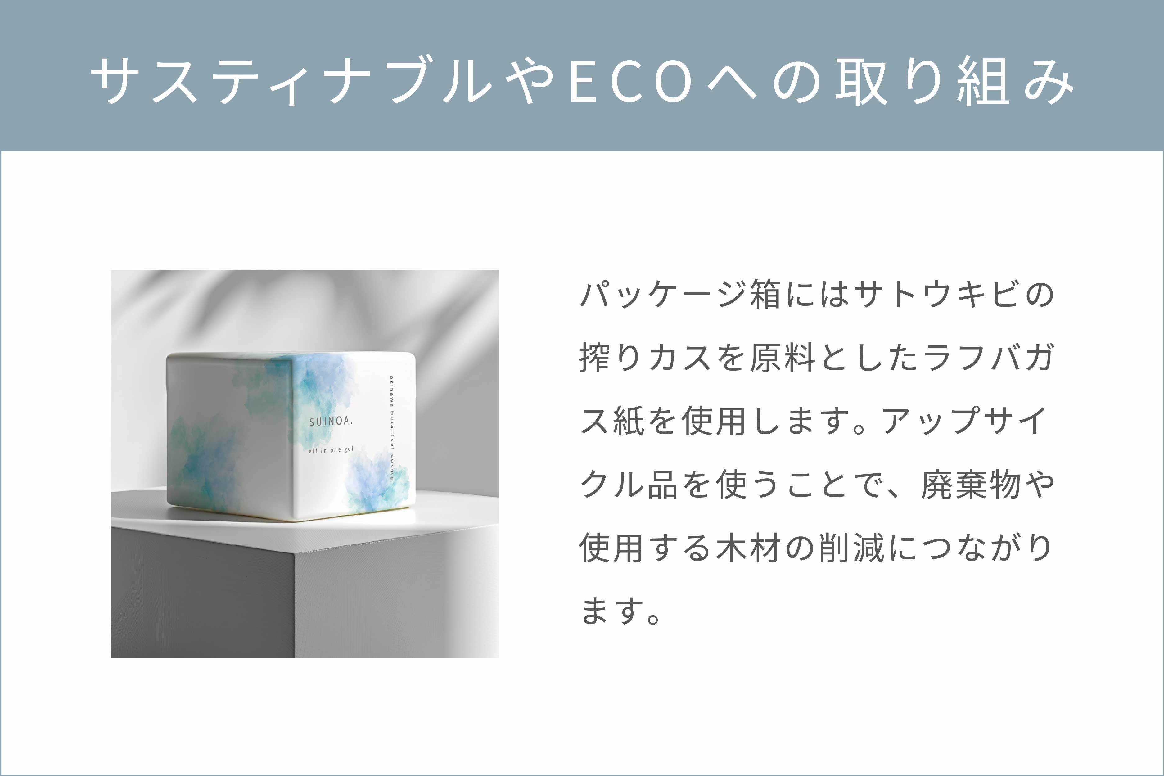 製品パッケージには、サトウキビの搾りかすを原料にしたラフバガス紙を使用。これにより、廃棄物の再利用や木材使用の削減につながり、環境への配慮を実現しています。