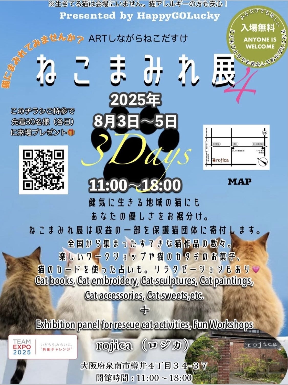 ねこまみれ展は毎回好評の保護猫活動支援のためのイベントです。ねこに関する雑貨やお菓子、占いやリラクゼーションのマルシェが出店します。主催は、泉南市の団体HAPPYGOLUCKYです。今日は初日で日曜日ともあり大勢のお客様が来場されました!ケーブルテレビの取材もありました!クラウドファンディングの案内コーナーも設置しました。一瞥すげなく1日が過ぎましたが、この会の趣旨は保護猫活動のためです。明日と明後日までの3日間の開催です。