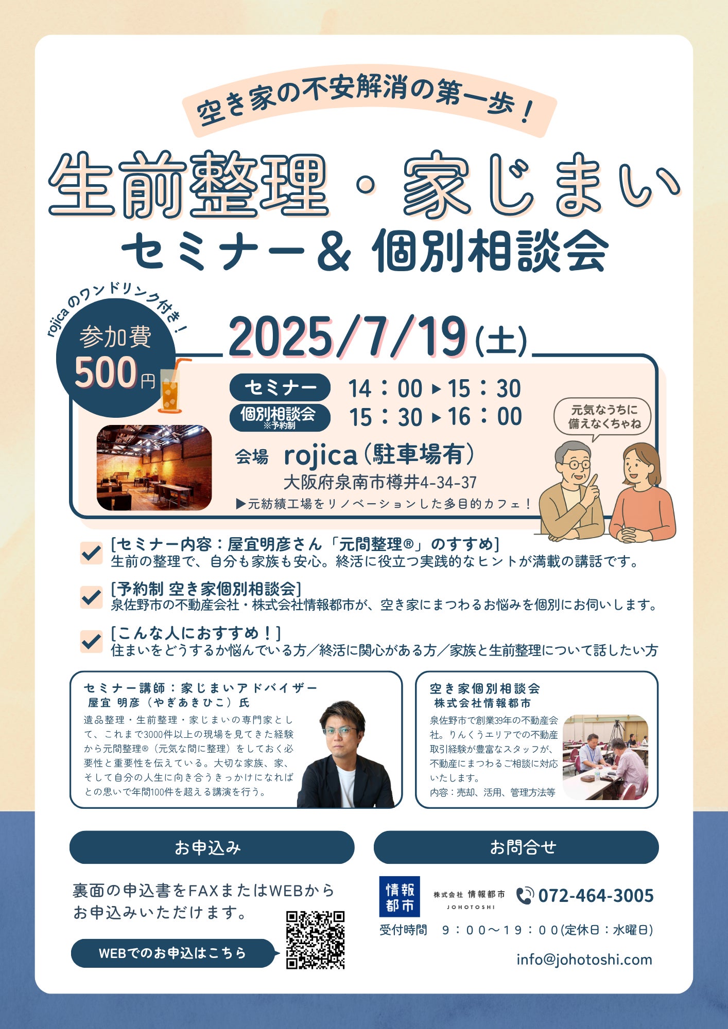 株式会社情報都市(泉佐野市)さん主催の空き家対策セミナーを開催しました!今日は『生前整理·家じまい』をテーマに屋宜明彦氏を講師に招いてのセミナーでした。元気な間に生前整理、『元間整理』。大事な思い出の品も、空き家になってしまうお家も、誰にでも訪れる日のために。とても役に立つお話でした!クラウドファンディングのチラシもお配りして、支援いただいた方もいらして、直接お話しできて嬉しかったです!