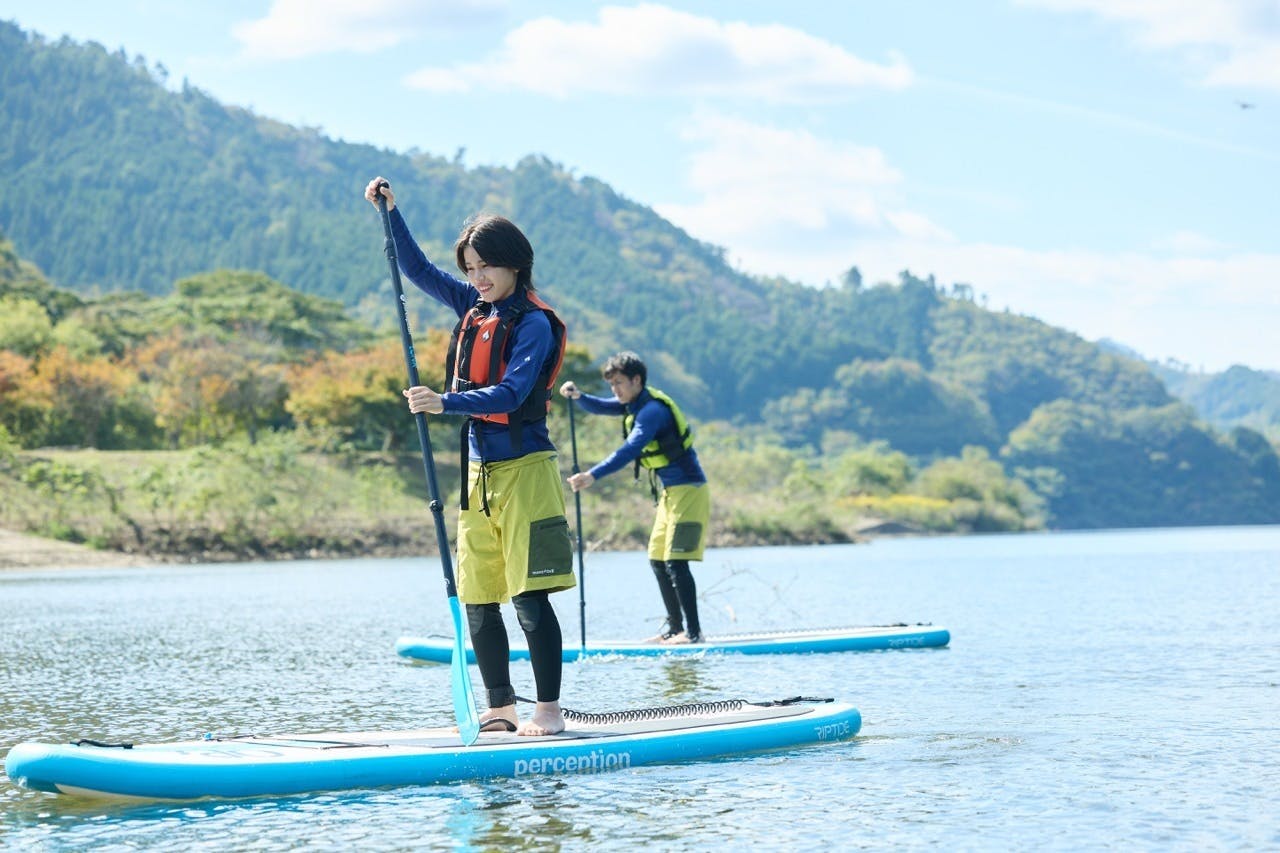 雄大な山々に囲まれた奥津湖は、湖面が穏やかで水も澄んでおり、初めての方にもぴったりのフィールドです。ライセンスを持つインストラクターがやさしくサポートするので、小さなお子さまや初心者の方でも安心してチャレンジできます。
