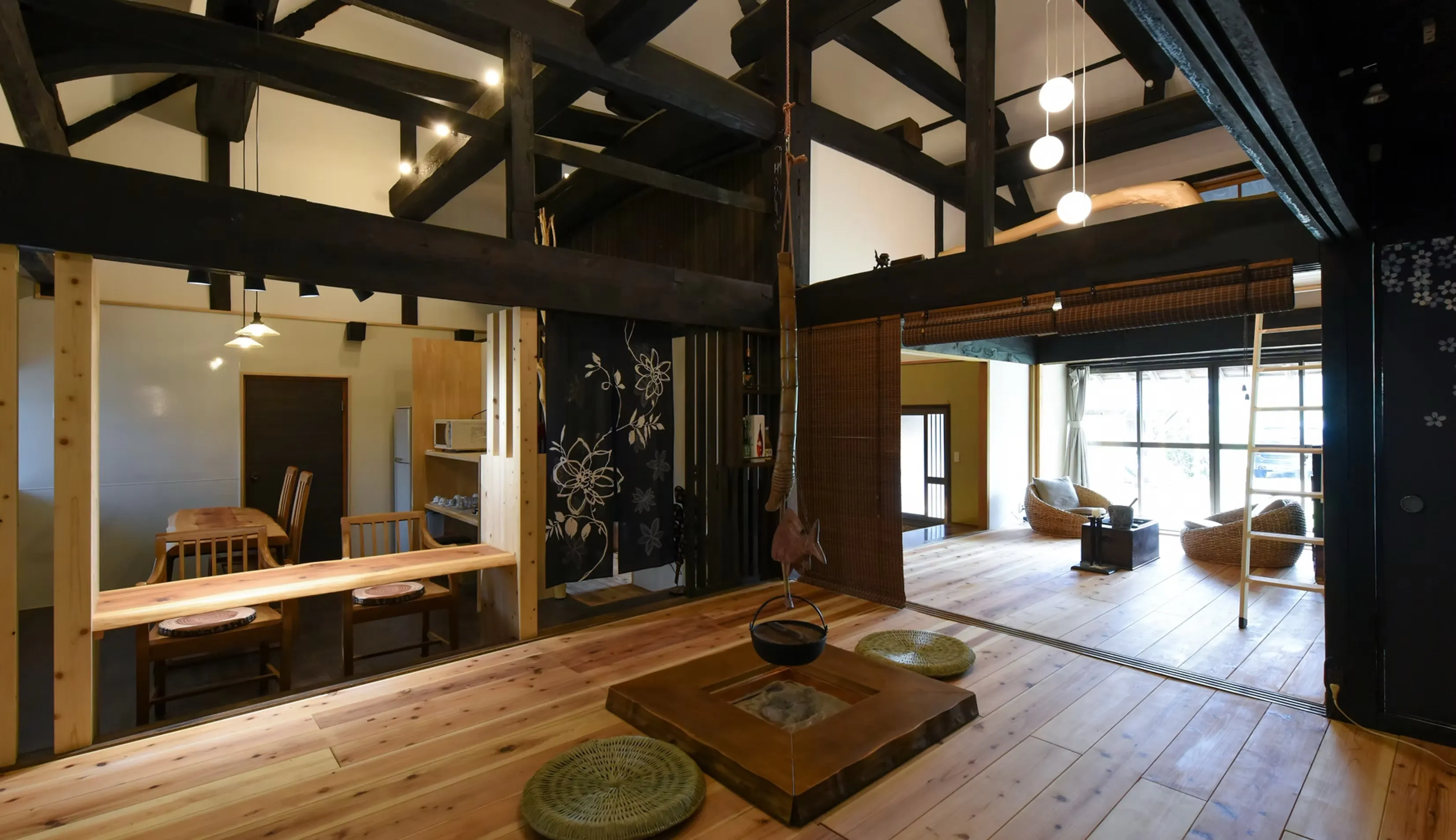 鏡野町の自然に囲まれた静かな里に佇む宿、さいの郷「椛」。リニューアルされた古民家は、梁や柱の温もりを感じる落ち着いた空間で、ゆったりとくつろげます。ヒノキ風呂に浸かり、澄んだ空気と小鳥のさえずりに癒されるひとときは格別です。