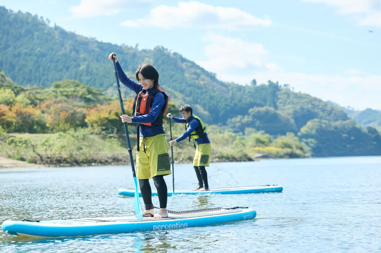 SUPでは立ってパドルを漕ぎ、湖上をスーッと進む爽快感を体感。カヤックでは、座ったまま水面をゆったり進み、自然と一体になるような癒しの時間を楽しめます。