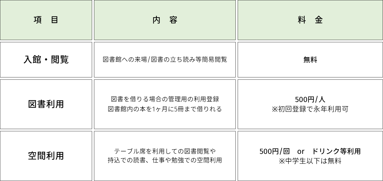 テーブル席等を利用しての30分以上の利用については、空間利用料の支払いまたはチャレンジショップのご利用をお願いします。空間使用料を支払う場合、店内設置予定のセルフドリンクコーナーのドリンクをご利用いただけます。