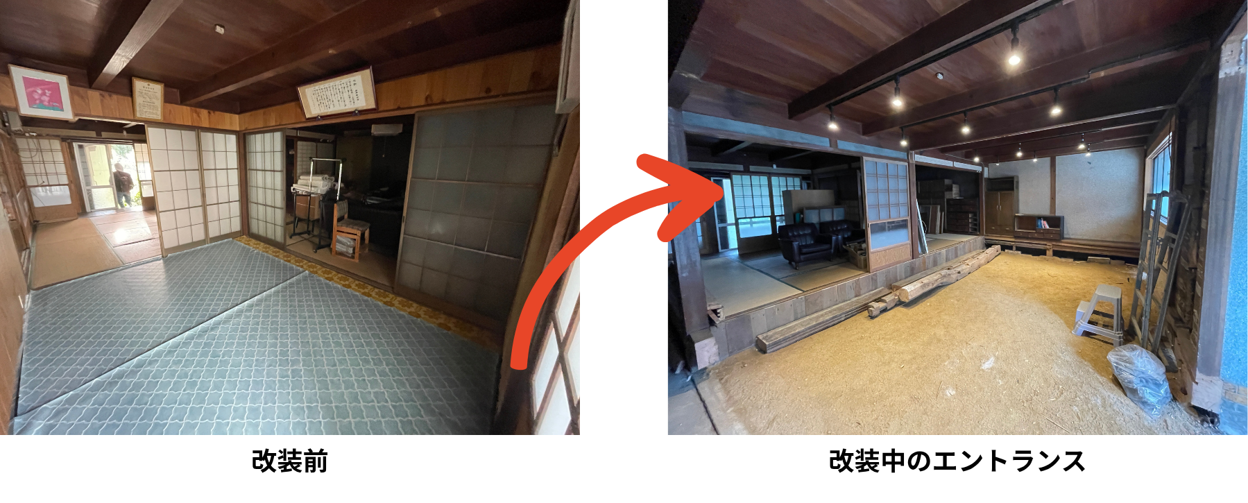 玄関を入ってすぐの部屋の床を解体し、広い土間を活かした開放的な図書館の空間を作るための改修工事をスタートしています。