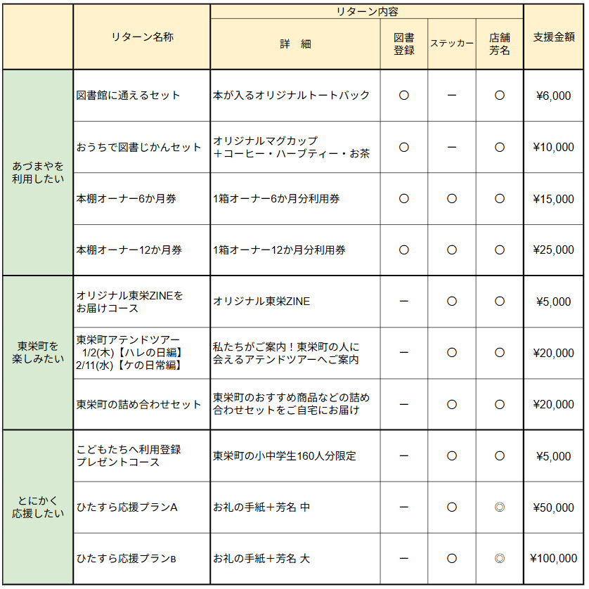 さまざまな利用シーンやご希望に合わせたリターンをご用意しました。ぜひ、ご支援をきっかけにあづまやや東栄町への関りを深めていただけたら嬉しいです。