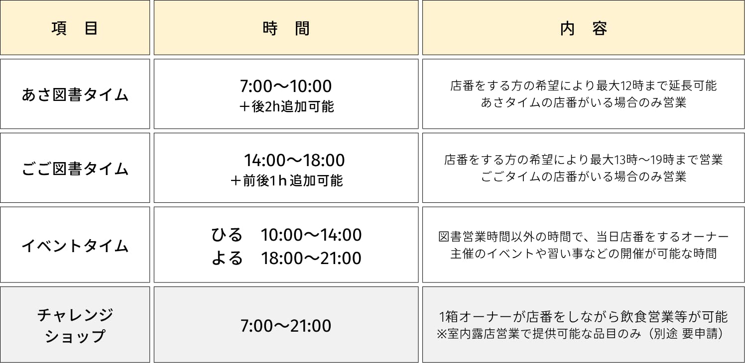 図書利用の妨げにならないように図書タイムとは別で、イベントやワークショップなどの開催をお店番する1箱オーナーが利用できる時間を設定します。お店番をしていただくと、自身の習い事なども開催が可能です。