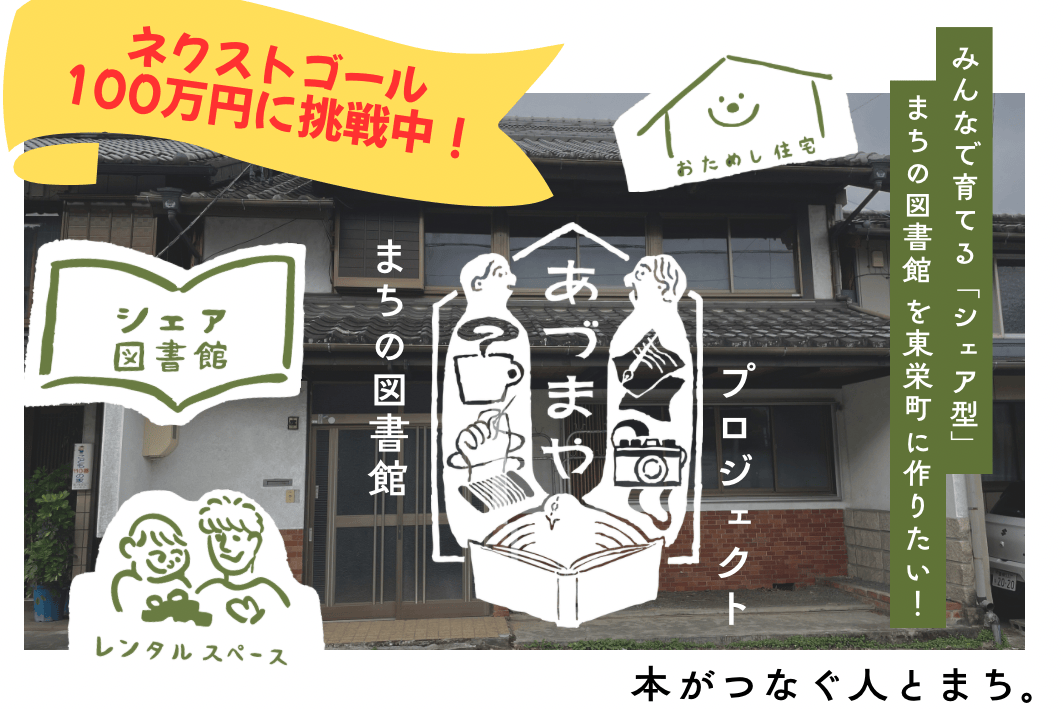 今回、この空き物件となっていた元あづまや洋品店を改修し、本をシェアする「まちの図書館 あづまや」を一緒につくってくれる仲間を募集したいと思い、クラウドファンディングに挑戦します!