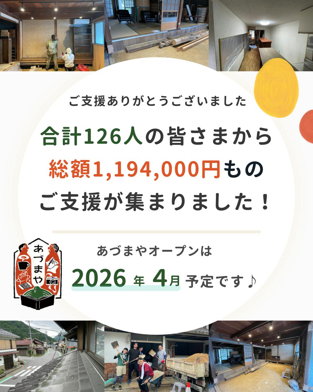2025/12/16 20:54【ご支援ありがとうございました】 約1ヶ月半ほどのクラウドファンディング期間が11月30日に終了しました。 多くの方のご支援やシェアやお手伝いなどでの応援、本当にありがとうございました! ※お知らせが大変遅くなりまして申し訳ございません。 (12/1に投稿したつもりが出来ておりませんでした…汗)webでのご支援:1,109,000円 直接のご支援:85,000円 総勢126名、総額1,194,000円ものご支援いただきました。 みなさんの想いと共にますはOpenまで工事を頑張ります!!! リターンはこれから準備をしていきますので、2026年の1月以降に準備ができたものから順次発送させていただきます。 工事の状況や、オープンまでのあれこれは活動報告やInstagramでアップしていきますので、見守っていただけたら幸いです。 なお、12月- 1月は改装工事をじゃんじゃんやっております! 今のところ決まっている日程は画像をチェックしてくださいね!お手伝いも大歓迎でーす◎2026年の4月の本格オープンに向け走っていきます!引き続き皆さん、どうぞよろしくお願いします。 もっと見る