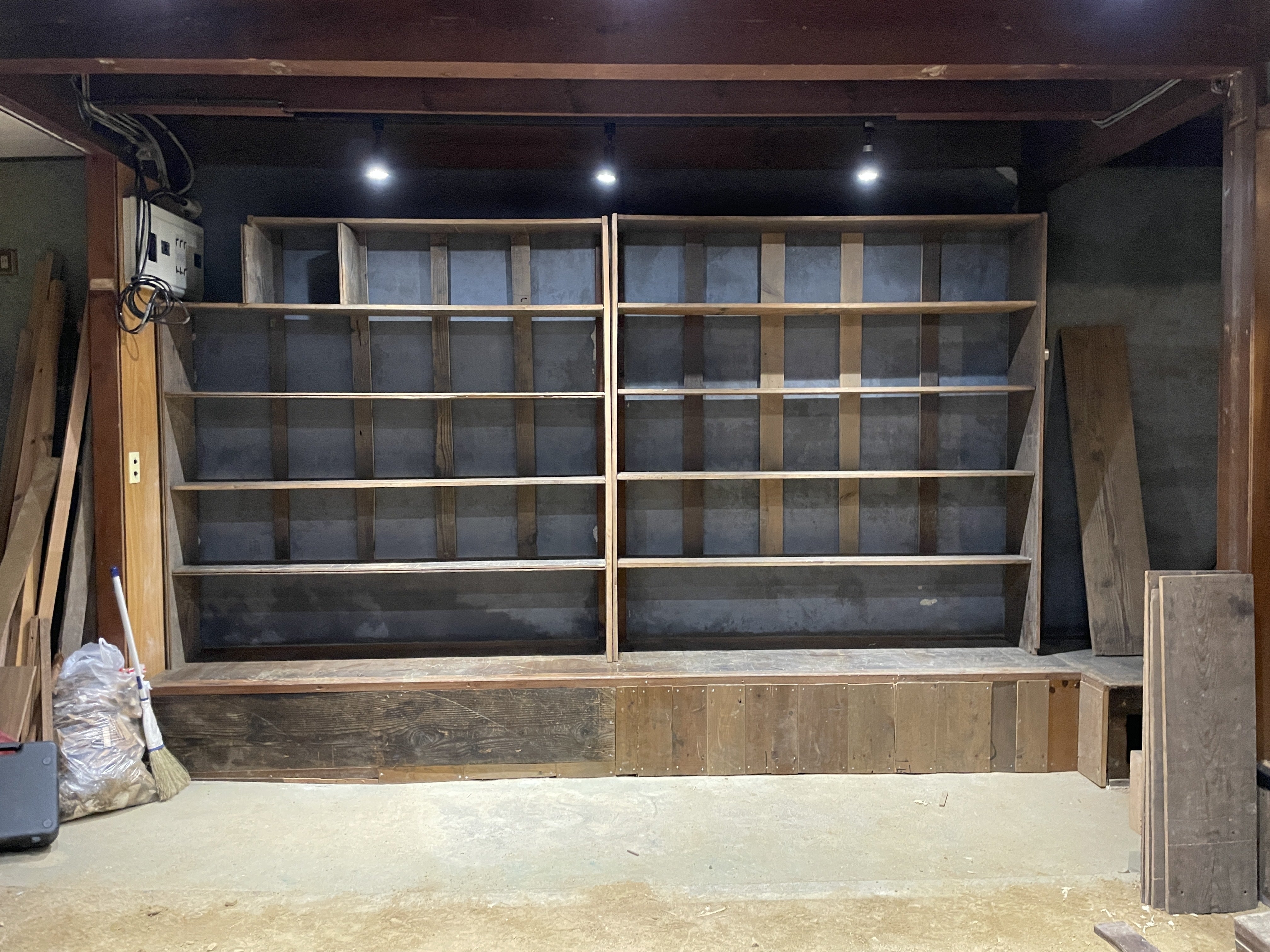日々、コツコツと改装作業を進めてまして、先日解体作業で出てきた床材の古材を使ってあづまやプロジェクトのメインコンテンツとなる図書館の本棚を作製中です。