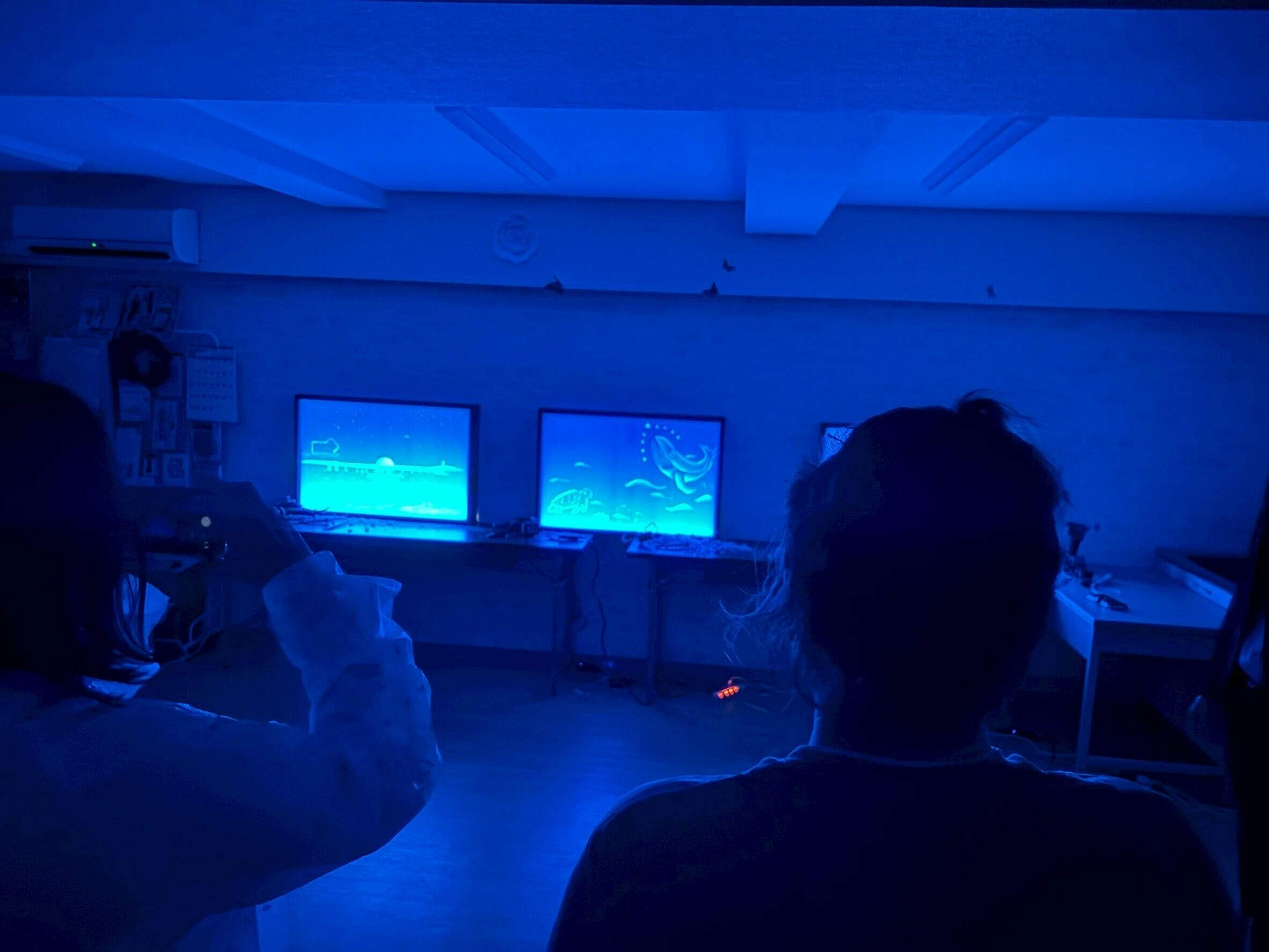 光彫りがつくり出す青い幻想世界。その空間に身を委ねることで、まるで水の中にいるような没入体験が生まれます。