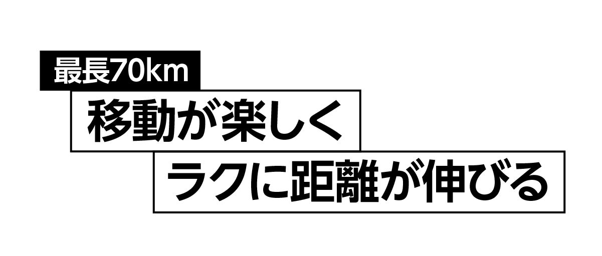 少ない労力で長く走行することが可能。最大走行距離50〜70km。