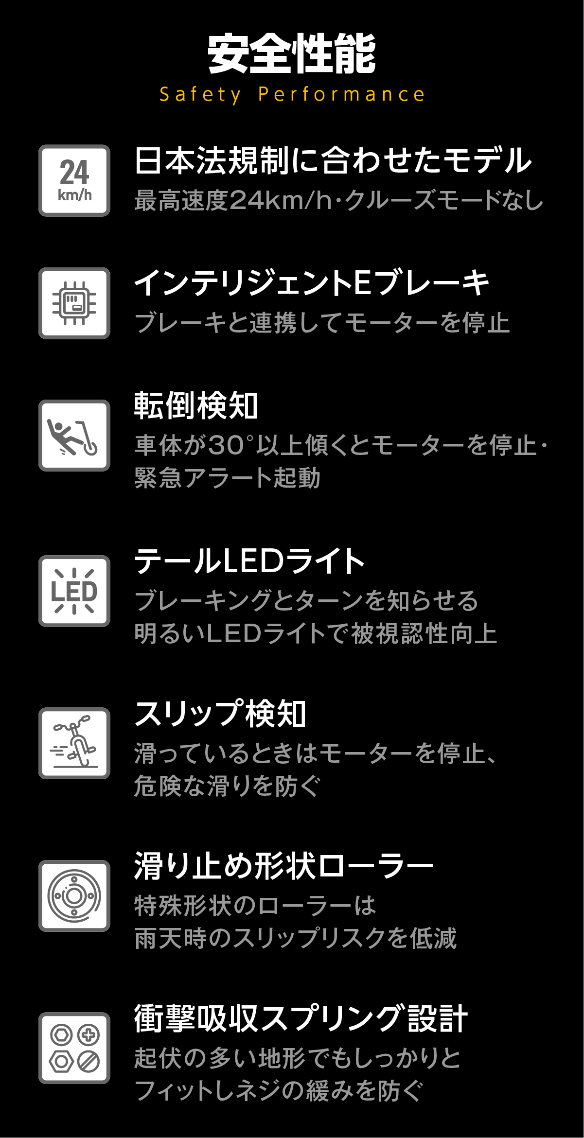 さらに7つの安全機能で安心してライドを楽しめるよう設計されています。