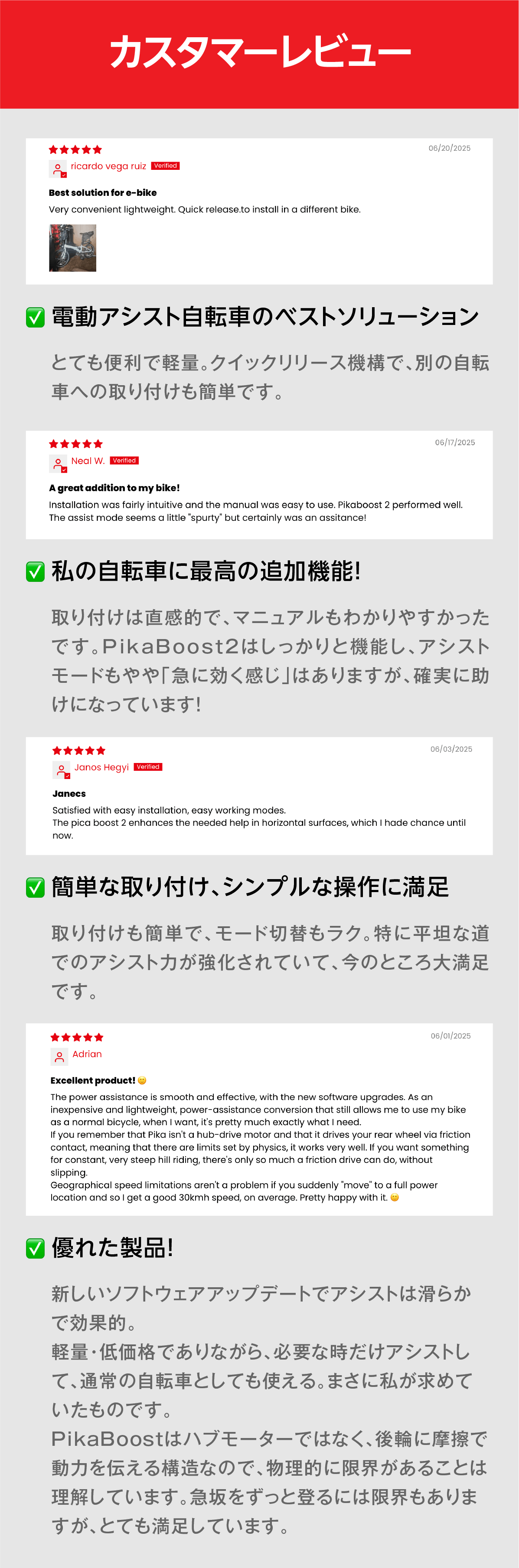 私たちが日本で販売するPikaBoost2 Proは日本の交通法の「電動アシスト自転車」に適合させたモデルで、免許・ナンバー・自賠責保険不要です。