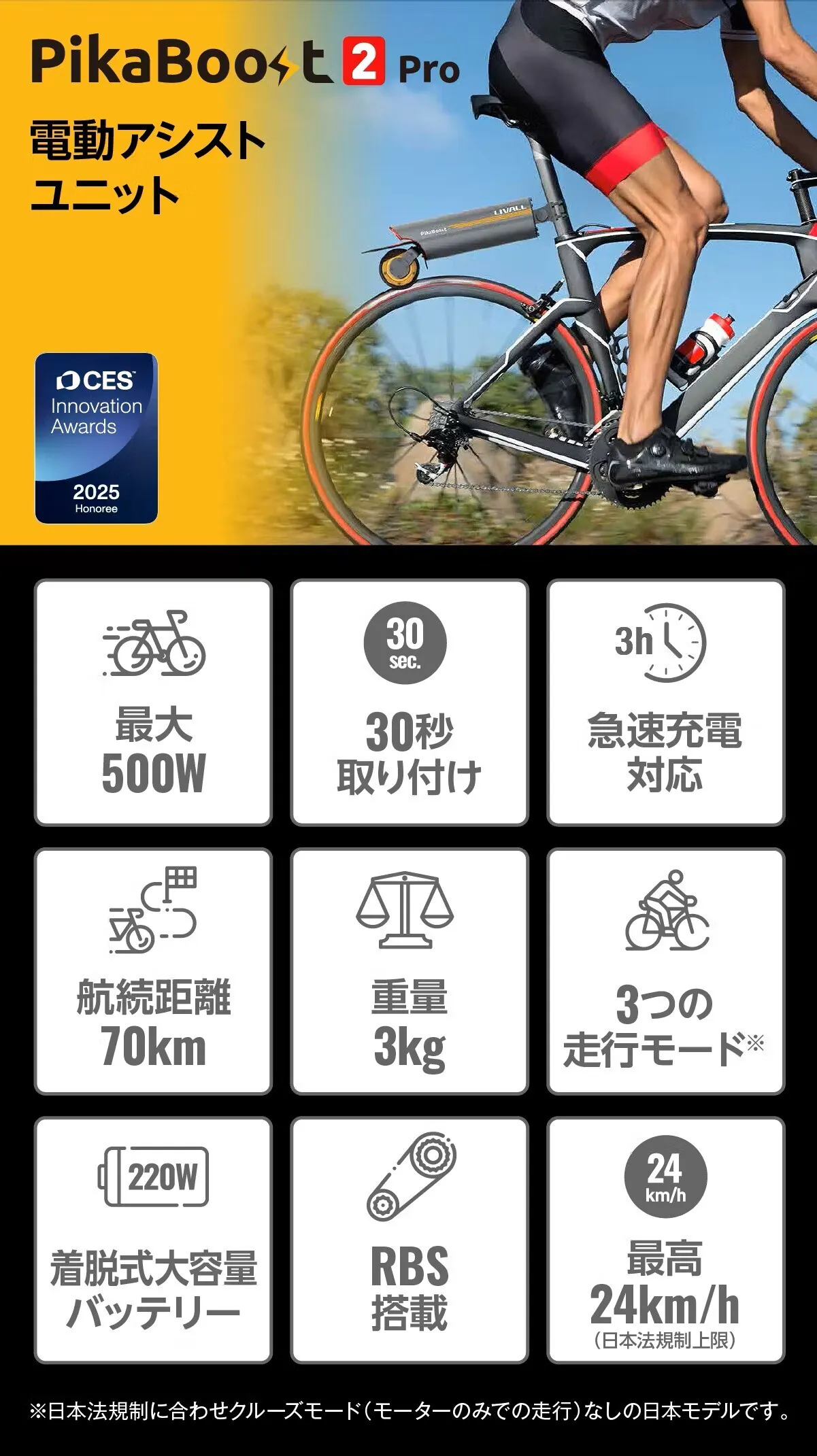 30秒で装着でき、軽量・静音・パワフルな走りを実現します。