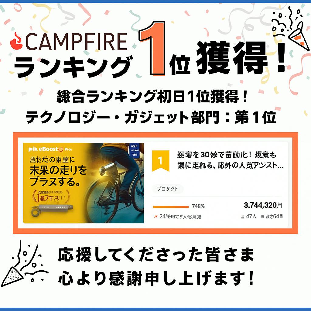 開始早々に370万円を突破しました!公開初日から多くの方にご支援いただき、本当にありがとうございます。初日から大反響初日限定割の一部は、予想通りすぐに完売してしまいました…。ですが、まだご安心ください!割引率の高いリターンは数に限りはありますが、今ならまだ間に合います。この機会を逃さず、ご覧ください。ご安心ください・PikaBoost 2 Pro は 日本の道路交通法に適合した仕様です。・正規代理店として弊社がしっかりサポートしますので、使い方に不安がある方も安心してお使いいただけます。引き続き、PikaBoost 2 Pro をよろしくお願いいたします。