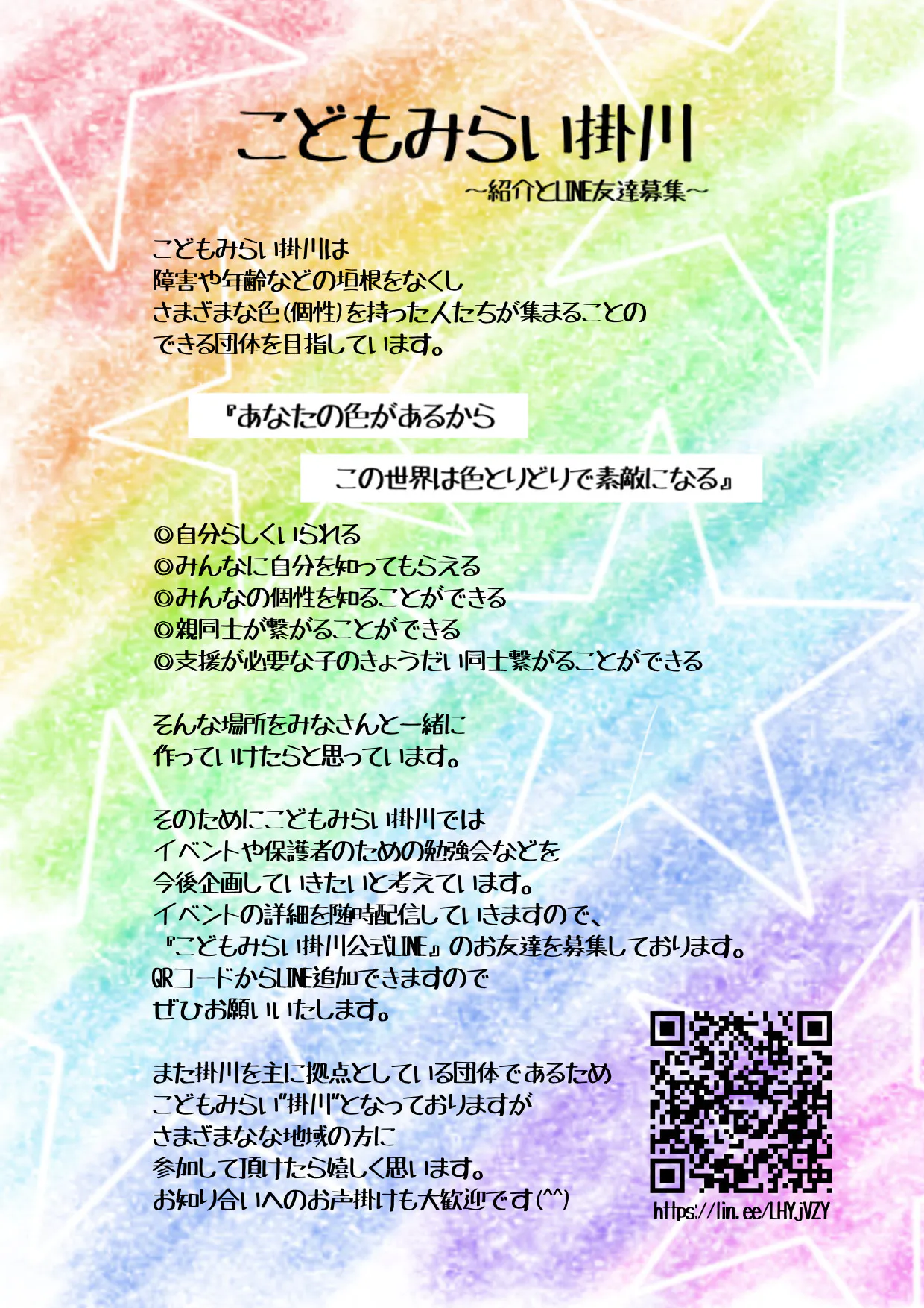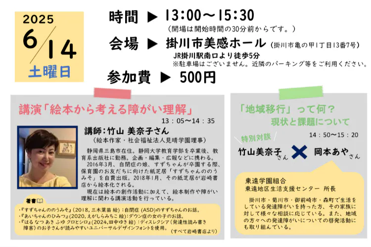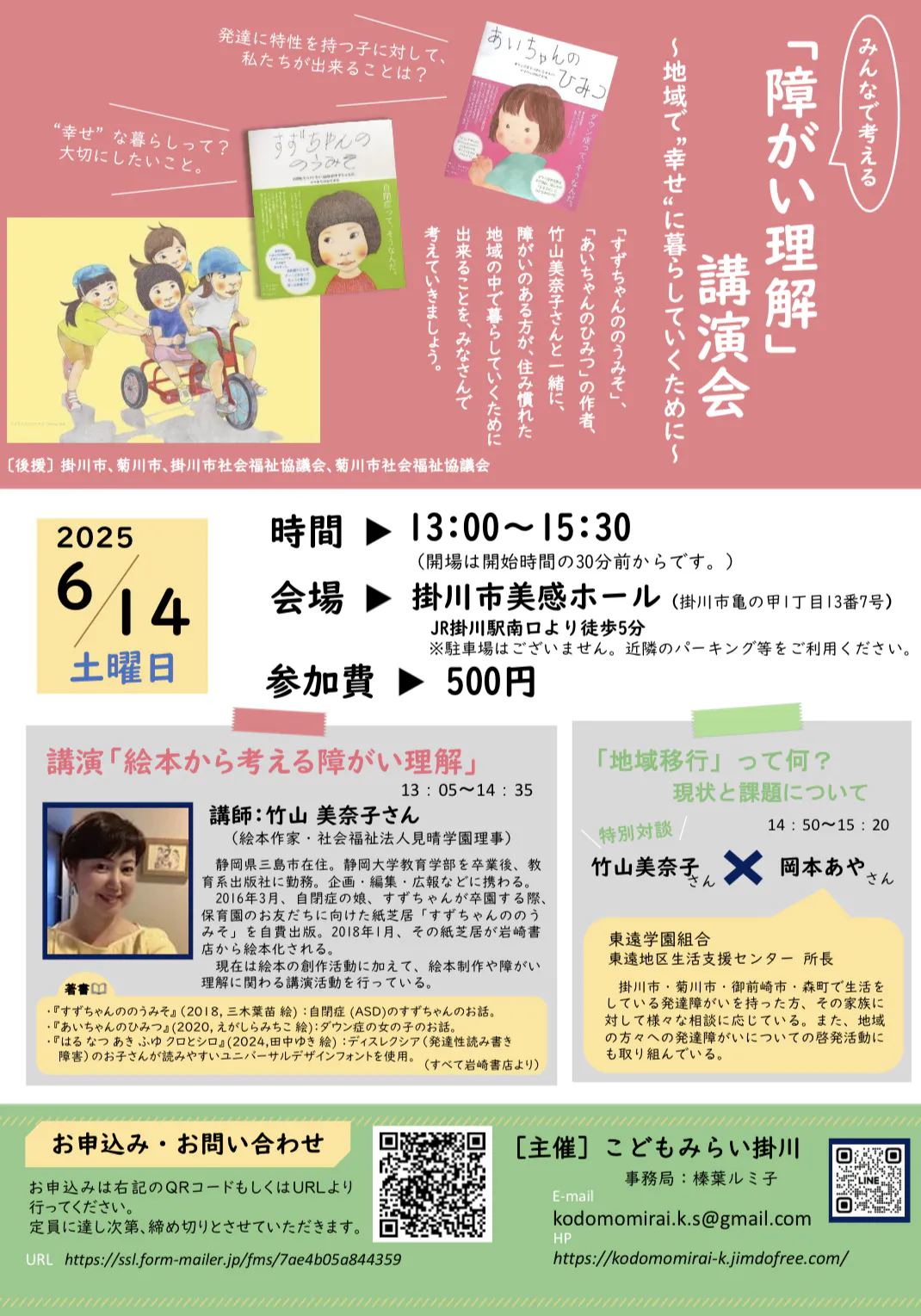 2025/06/15 09:36第1部の講演では、絵本作家である竹山美奈子さんが、娘のすずちゃんと地域とがどうかかわってきたのか、育てるときに何を意識してきたのかをお話しいただきました。「ご機嫌で笑顔な子に育てる」ことを意識していたという話が印象的でした。第2部では、岡本あやさんと竹山さんとの対談でした。実際に当団体に寄せられた3つの相談にこたえる形で、対談を行いました。相談1降園後娘と遊びに行く場所がありません。娘は、興味があると相手がだれであれ奪い取ったり、相手の髪を引っ張ったりするため、たくさんのお子さんが遊ぶ公園に行っても、相手のお子さんを怪我させてしまったらと気が気ではありません。相談2高等部卒業後、家と事業所との往復のみで、休日も家で一人で過ごしています。周囲や地域とのつながりが全くなくなってしまい、今後の生活に不安を感じています。相談3現在、生活支援事業所を設立しようと奔走しています。しかし、資金や人材確保など、苦戦しています。難しいことも多いと思いますが、お二人はどのような思いで福祉と向き合っていますか。どの相談にも、具体的で希望とユーモアのある考えを提示してくださり、聞いていてワクワクする内容でした。「安心して楽しく暮らせる地域を、つくっていこう!!」そんな気持ちになれる会になりました。皆さま、ご支援誠にありがとうございました。皆様のおかげで、今回このような会を開くことができました。これからも、活動を続け地域に貢献していけたらと思っております。それでは、失礼いたします。こどもみらい掛川 代表 松本里美 もっと見る明日はいよいよ「障がい理解」講演会です