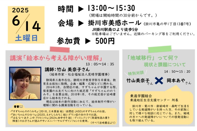 2025/06/15 09:36第1部の講演では、絵本作家である竹山美奈子さんが、娘のすずちゃんと地域とがどうかかわってきたのか、育てるときに何を意識してきたのかをお話しいただきました。「ご機嫌で笑顔な子に育てる」ことを意識していたという話が印象的でした。第2部では、岡本あやさんと竹山さんとの対談でした。実際に当団体に寄せられた3つの相談にこたえる形で、対談を行いました。相談1降園後娘と遊びに行く場所がありません。娘は、興味があると相手がだれであれ奪い取ったり、相手の髪を引っ張ったりするため、たくさんのお子さんが遊ぶ公園に行っても、相手のお子さんを怪我させてしまったらと気が気ではありません。相談2高等部卒業後、家と事業所との往復のみで、休日も家で一人で過ごしています。周囲や地域とのつながりが全くなくなってしまい、今後の生活に不安を感じています。相談3現在、生活支援事業所を設立しようと奔走しています。しかし、資金や人材確保など、苦戦しています。難しいことも多いと思いますが、お二人はどのような思いで福祉と向き合っていますか。どの相談にも、具体的で希望とユーモアのある考えを提示してくださり、聞いていてワクワクする内容でした。「安心して楽しく暮らせる地域を、つくっていこう!!」そんな気持ちになれる会になりました。皆さま、ご支援誠にありがとうございました。皆様のおかげで、今回このような会を開くことができました。これからも、活動を続け地域に貢献していけたらと思っております。それでは、失礼いたします。こどもみらい掛川 代表 松本里美 もっと見る明日はいよいよ「障がい理解」講演会です