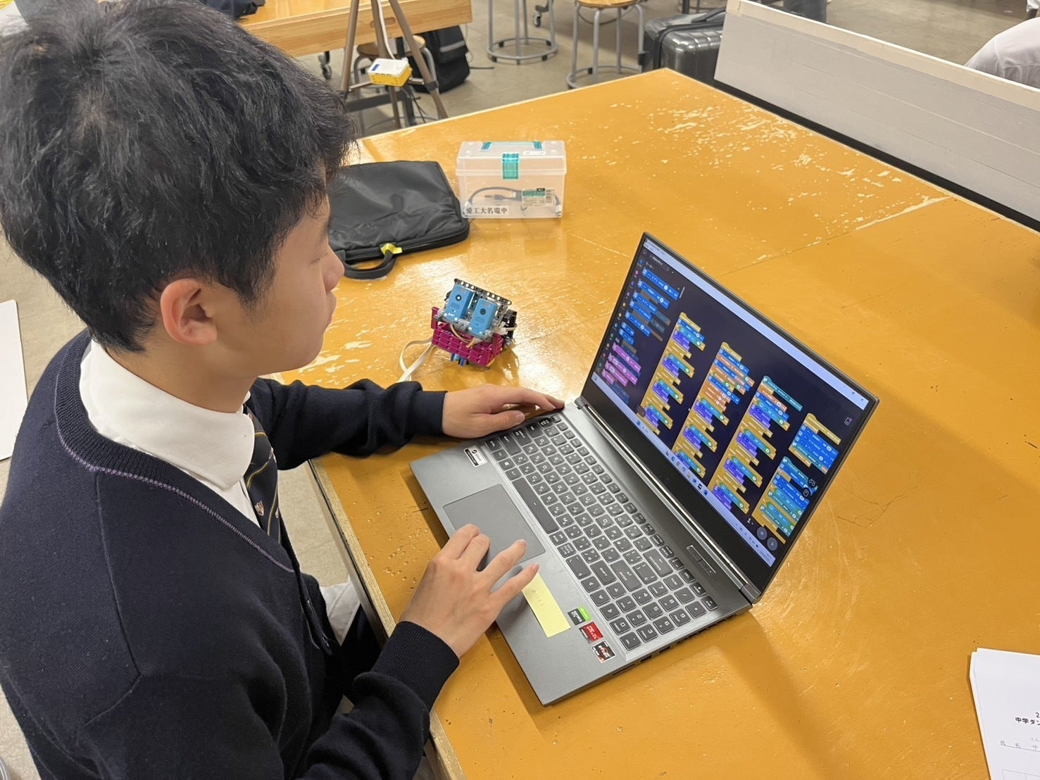 オンステージというのは、自分たちだけで考えたロボットをステージの上で1分30秒以上のパフォーマンスをし、技術力、創造性を競い合う競技で、準備や片付けを含めて7分以内となっています。今僕たちは日本代表として多くの国の代表チームと交流ができるように頑張っており、パフォーマンスを見やすく改良し、ポスターを日本語から英語にするなどを準備しています。