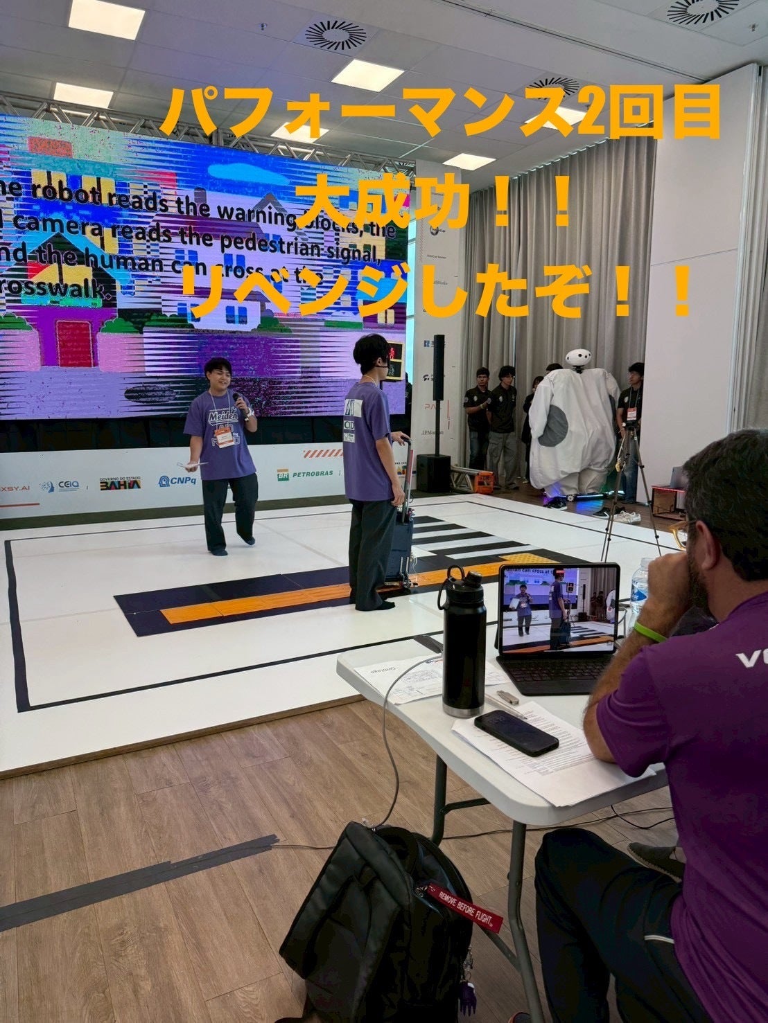 パフォーマンス2回目は成功しました!!応援ありがとうございました!!この後、スーパーチームという競技の準備です!今年は、メキシコとUAEとチームを組んで、新しいパフォーマンスをつくります。今年のテーマは『スポーツ』です。言葉の壁や文化を乗り越えて、交流しながら、どんなパフォーマンスができるかお楽しみにしてください!また、ライブ配信も準備します!(スーパーチームとは、世界大会当日に発表される他国とのグループで、自分たちのもってきたロボットを利用(再構築)して、発表されるテーマのパフォーマンスを行う競技です。)