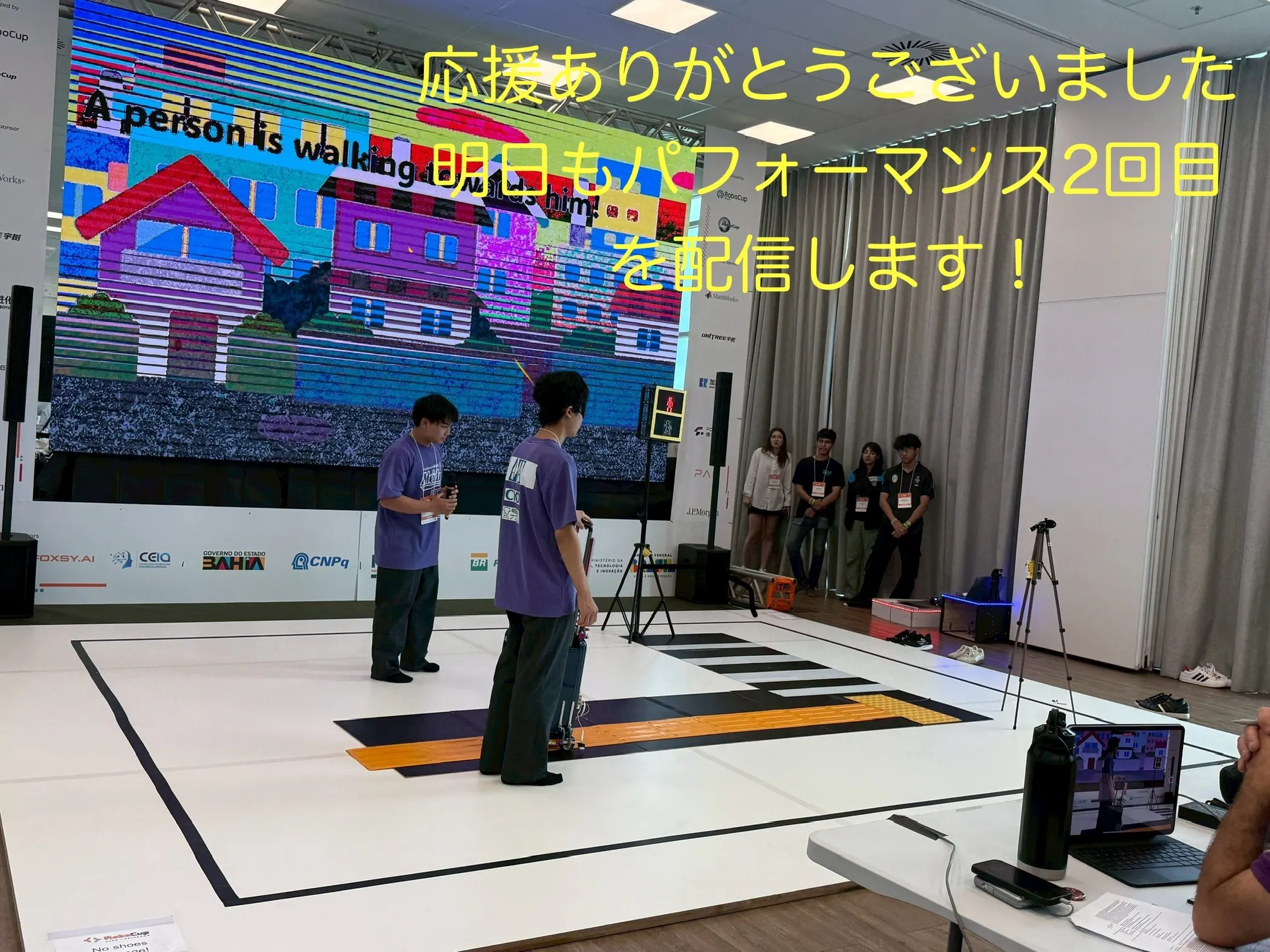 少しトラブルがあり、悔しい内容でしたが、明日の2回目のパフォーマンスに向けて、ロボットの調整をしていきます!
