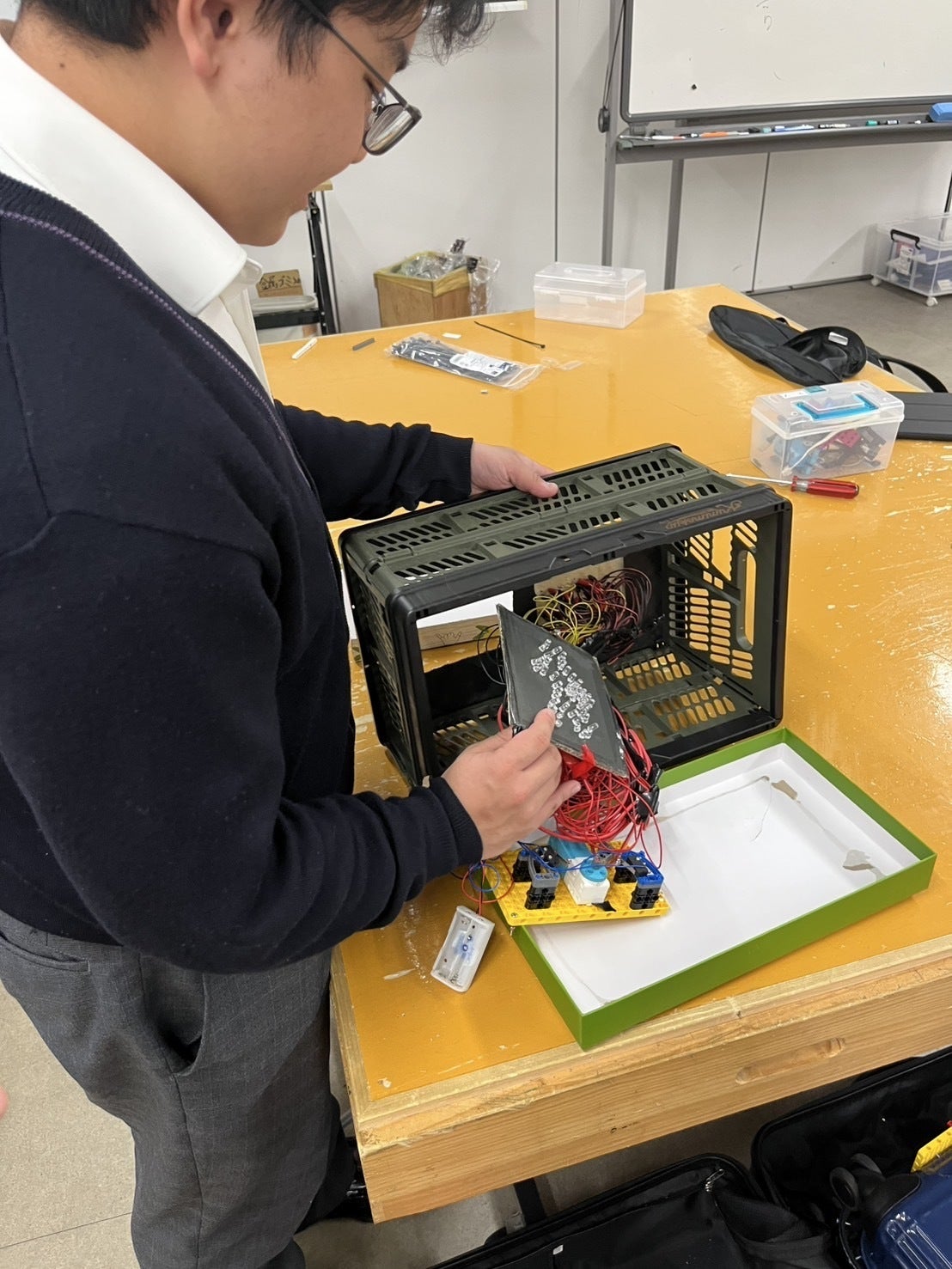オンステージというのは、自分たちだけで考えたロボットをステージの上で1分30秒以上のパフォーマンスをし、技術力、創造性を競い合う競技で、準備や片付けを含めて7分以内となっています。今僕たちは日本代表として多くの国の代表チームと交流ができるように頑張っており、パフォーマンスを見やすく改良し、ポスターを日本語から英語にするなどを準備しています。