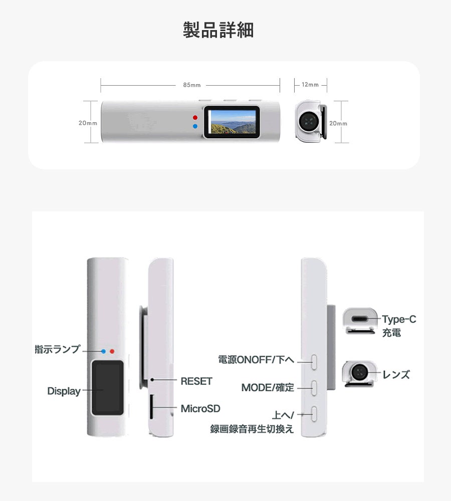 機能 2.7K動画撮影 わずか21g 録画 録音 スマホで再生 本体で再生 110°広角 内蔵バッテリー