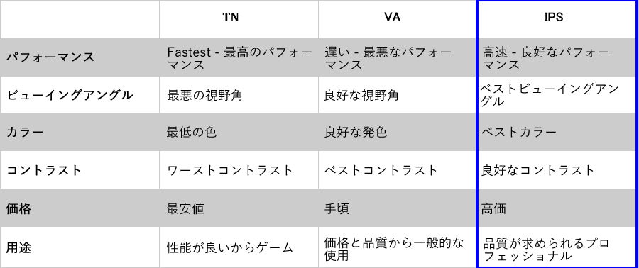 IPS方式の特徴は液晶分子に垂直方向の傾きがないため、「視野角が極めて広い」ことが最大の強みです。またIPSは、液晶ディスプレイの液晶の挙動を変化させ、より鮮明な画像を映し出してくれます。