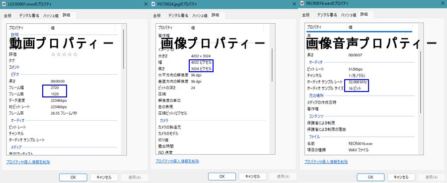 動画サイズは2720×1520P拡張子はMOB、画像サイズは4032×3024P(1200万画素)拡張子はJPG、音声のオーディオレート/サイズは32000kHz/16ビット拡張子はWAVファイルとなります。
