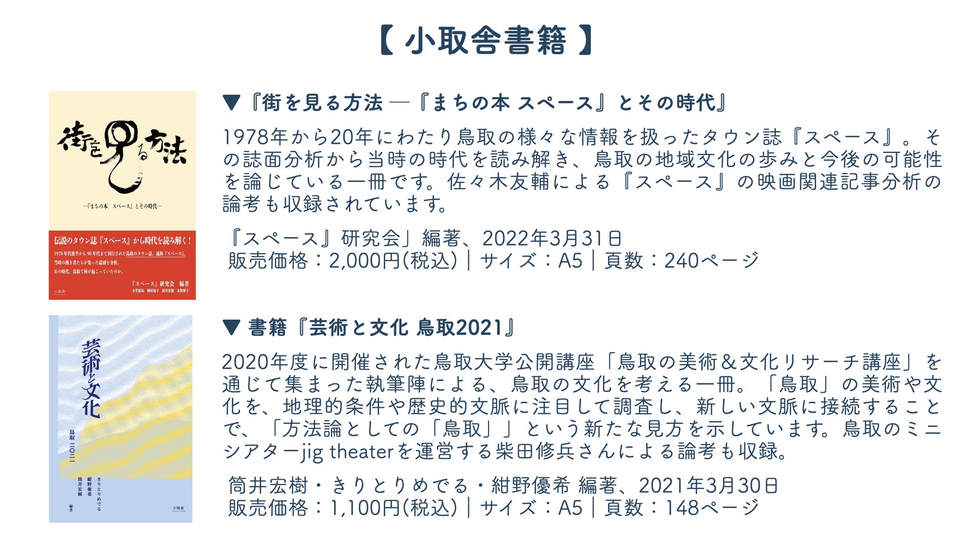 小取舎は、代表の私(村瀬謙介)が2020年11月に立ち上げた鳥取のひとり出版社です。主に鳥取にゆかりのある人物や著者、鳥取にちなんだ作品を紹介する出版活動を行ってきました。