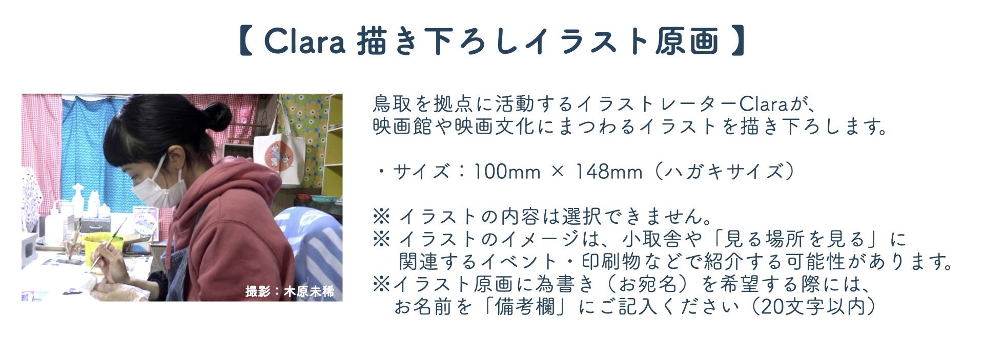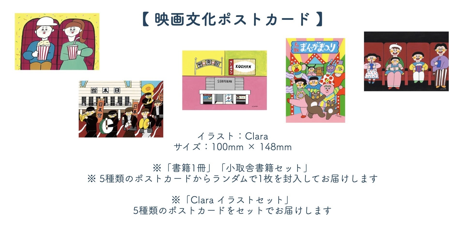 イラストレーターClaraの描き下ろした「書籍の表紙絵ポスター」と「映画文化ポストカード5点セット」を中心としたリターンです。