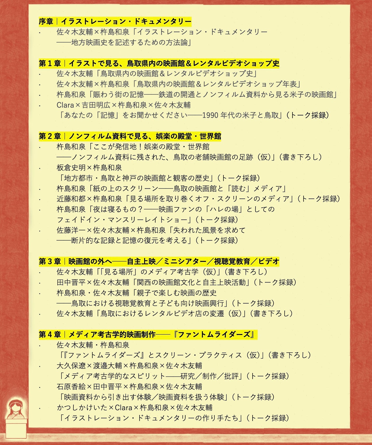 Claraさんが描いた映画館&レンタルビデオ店のイラスト約60点に加え、佐々木さんと杵島さんが執筆したテキストや年表、トークイベントの採録などを網羅的に収録予定。鳥取の豊かな映画文化を伝え、讃える活動を続けてきたプロジェクトの【 集大成 】となる書籍です。
