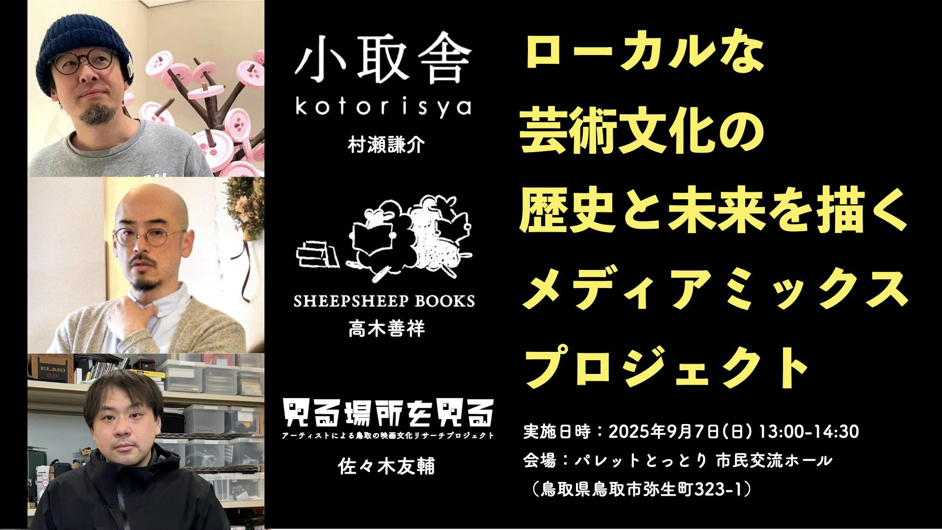 2025/08/27 18:14書籍『「見る場所」のメディア考古学』刊行記念イベントの日程が迫ってきました。第1弾は8月30日(土)18:00〜19:30に行うオンラインレクチャー「メディア考古学と芸術的リサーチの方法論」(参加応募〆切済)。リターンを購入された方には、メッセージで視聴リンクをお送りしましたのでご確認ください。そして第2弾となる刊行記念イベントは、「ローカルな芸術文化の歴史と未来を描くメディアミックス・プロジェクト」と題し、9月7日(日) 13:00〜14:30に鳥取市のパレットとっとり 市民交流ホール(鳥取県鳥取市弥生町323-1)で開催!小取舎の村瀬謙介、SHEEPSHEEP BOOKSの高木善祥、「見る場所を見る」の佐々木友輔が登壇し、地域に根ざした活動を続ける意義や、ローカルな芸術文化の歴史を語ることの意義について議論します。クラウドファンディングのリターン申し込みは終了しましたが、イベント参加者の追加募集をいたします。参加費は2,000円。「参加したい!」「リターン購入を逃してしまった!」という方は、ぜひぜひ以下のフォームからお申し込みください。https://forms.gle/dS8AtKFRFhMM5aXq8また会場内では、『「見る場所」のメディア考古学』の先行販売を行います!(販売価格:2,970円) これからご購入を予定されている方は、この機会にぜひ。 もっと見る