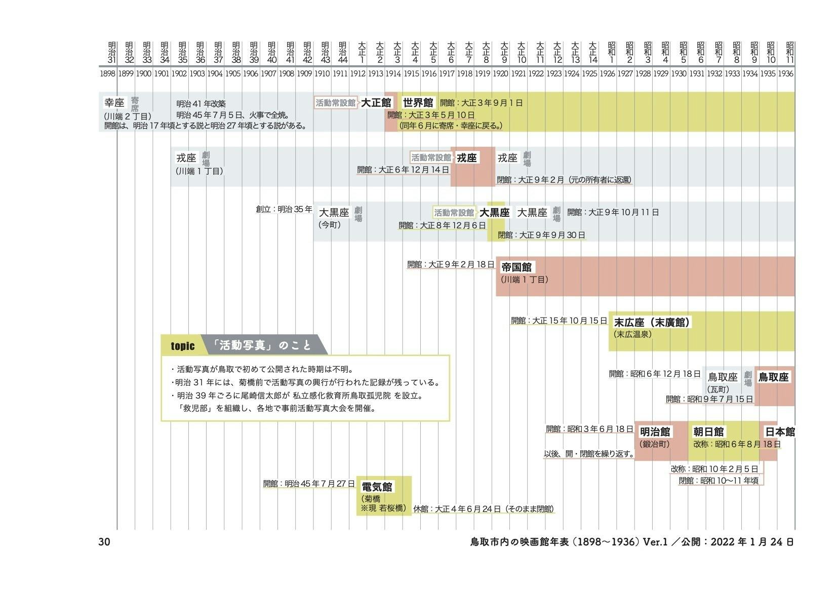 佐々木友輔さんと杵島和泉さんによる論考では、鳥取市・米子市・倉吉市・境港市の4市を中心に、情報の少ない郡部についてもカバーした、鳥取県の全域的な調査研究の成果を紹介しています。テキストと年表を併せて見ることによって、映画を「見る場所」の変遷や歴史のうねりを体感的に把握することができます。