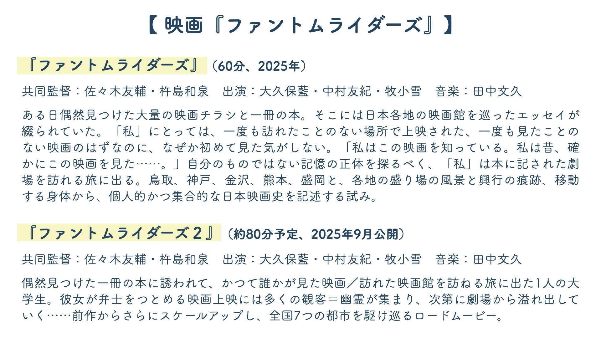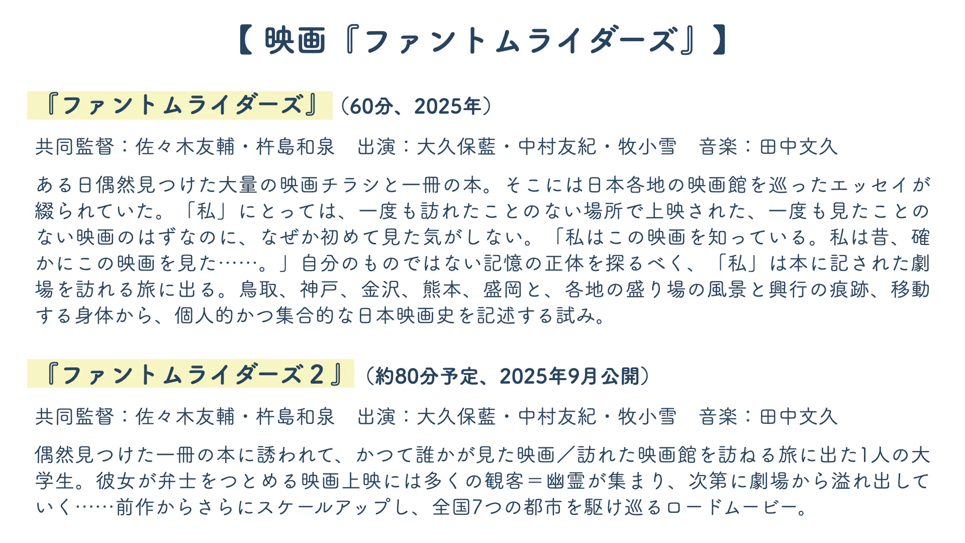 「ファントムライダーズ」はそうした誰かの"映画館との記憶"を擬似的に旅する作品です。