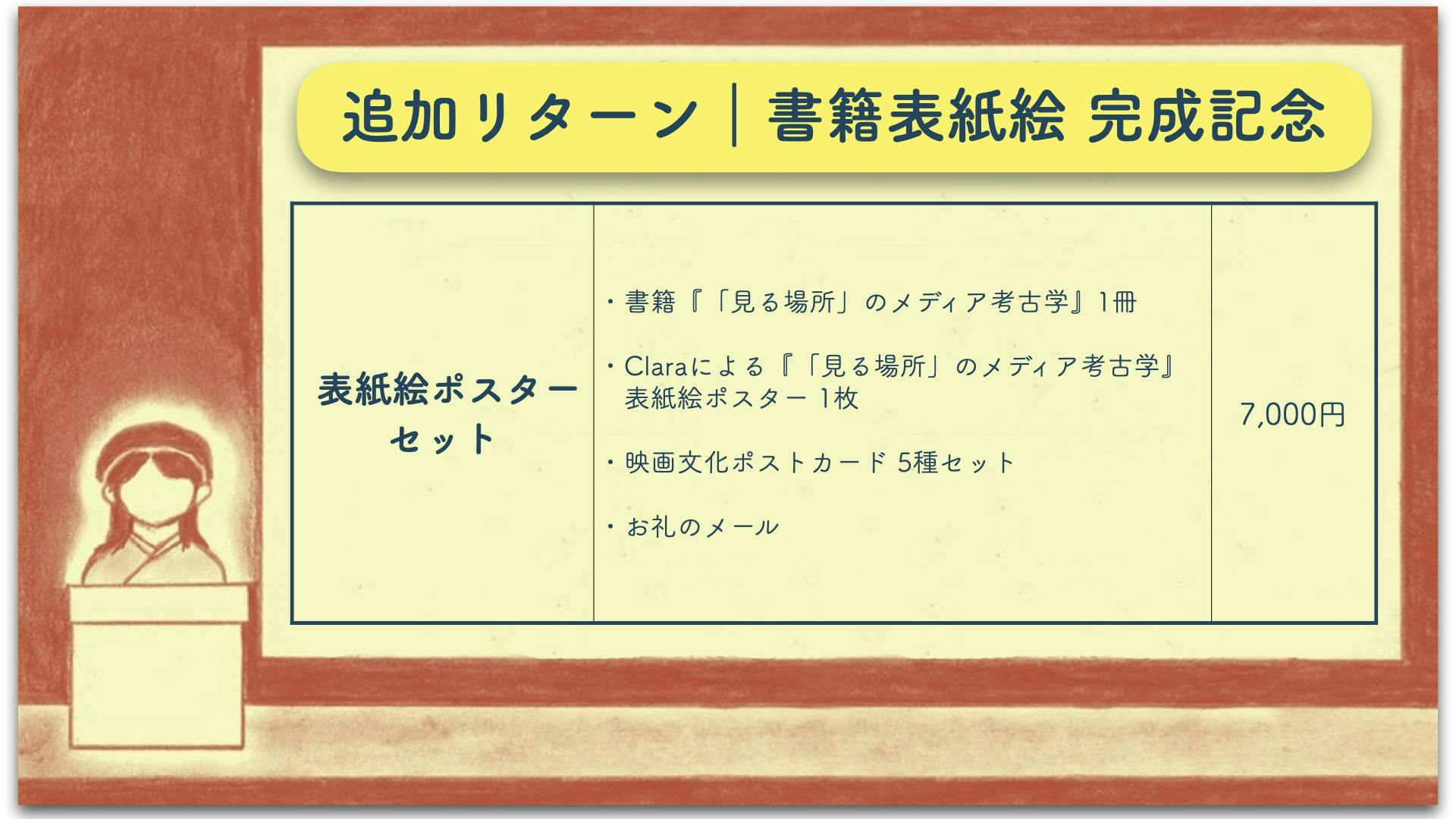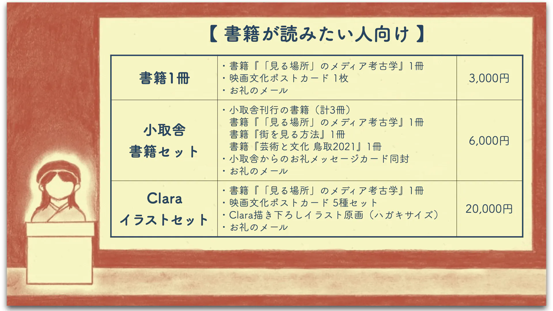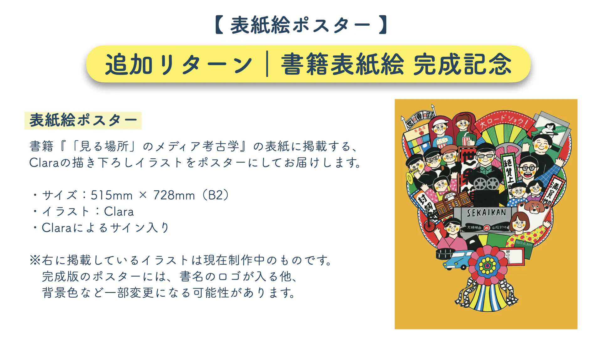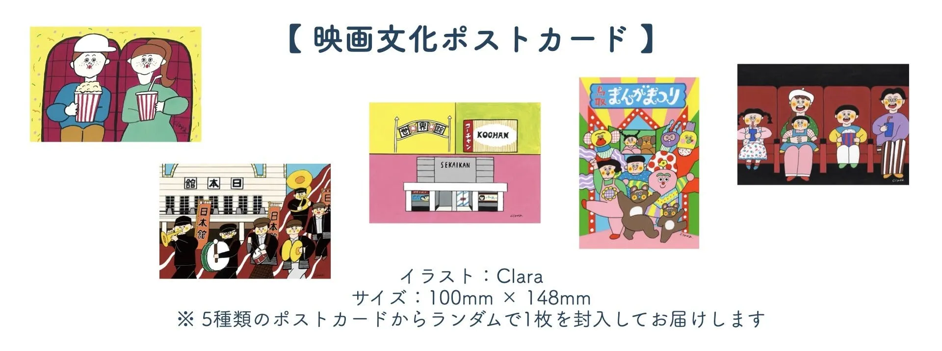 イラストレーターClaraの描き下ろした「書籍の表紙絵ポスター」と「映画文化ポストカード5点セット」を中心としたリターンです。
