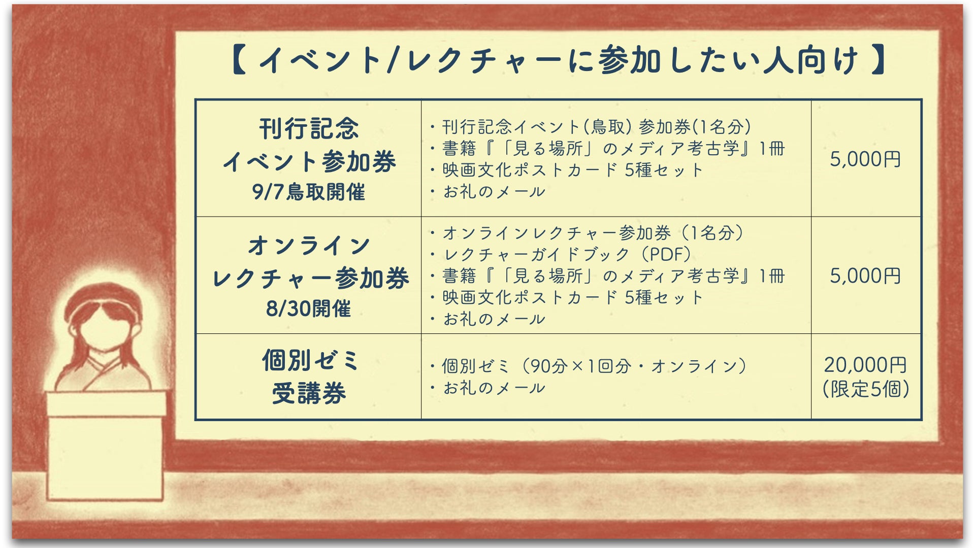 本クラウドファンディングでは、メディア考古学をより深く学びたい人向けのリターンも用意しています。「オンラインレクチャー参加券」「個別ゼミ受講券」には、書き下ろしのレクチャーガイドブック(pdf)も付属しますので、ぜひこの機会にお申し込みください!