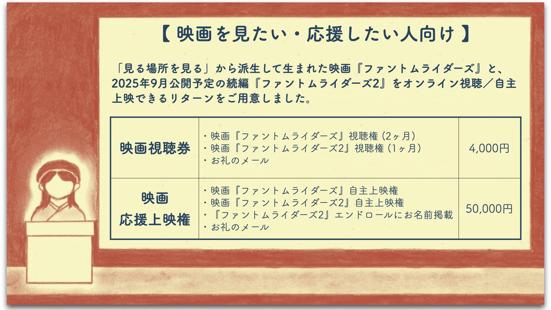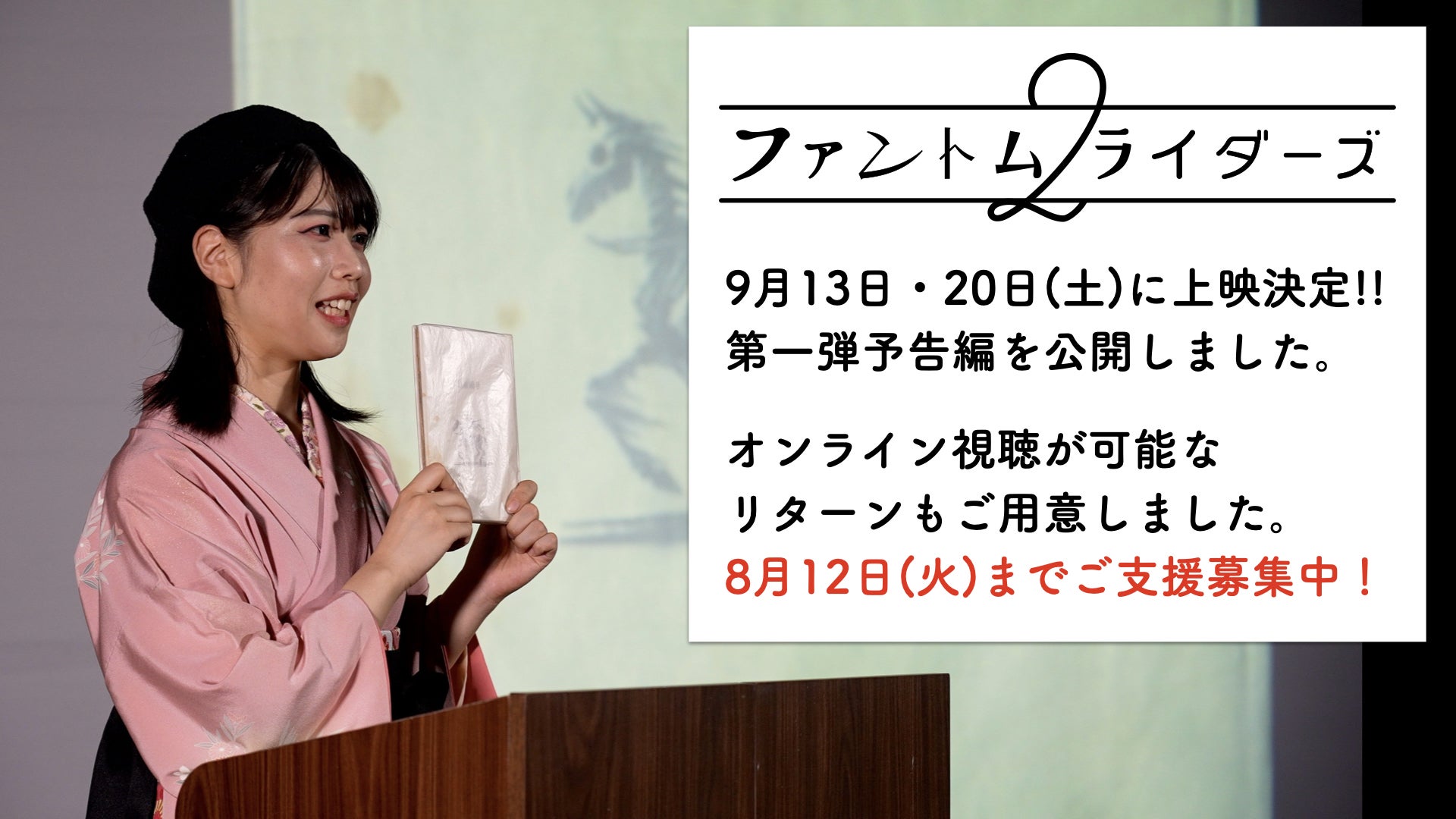 『ファントムライダーズ』および『ファントムライダーズ2』両作の自主上映を実施していただけるリターン「応援上映権」も、おかげさまで残り1枠。