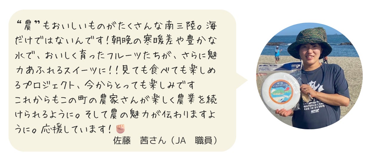 果物を育てる農家さんと、それをスイーツとして美味しく提供するお店で手を取り合い、魅力を伝えたい!という想いのもと、仲間に加わってくれました。