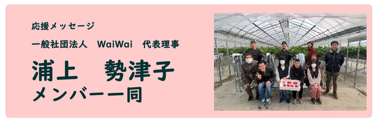 こんにちは 泉州泉南市でイチゴの栽培を行っているWaiWaiです。障がいを持ったメンバーと美味しいイチゴを育てています。泉州アグリさんには、企業でのマルシェで大変お世話になっています。今回、耕作放棄地の活性化のためクラウドファンディングを立ち上げられたことに感銘しています。地域の農業活性化のためにともに協力して行きたいと思っています。