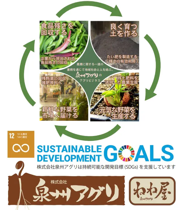 泉州アグリは、企業から排出される食品残渣を残渣輩出企業や近隣の養鶏場とも連携して発酵処理を行い、最終的に泉州アグリでたい肥を製造しています。このたい肥を使用することで、『化成肥料低減農業』が実現でき、有機栽培農業を進めて行くことが可能となります。化成肥料が高騰する中で農家にとってもコストメリットのある運営が可能となります。環境への貢献や持続可能な農業に寄与できるよう昨年度より新しく取り組んでいます。