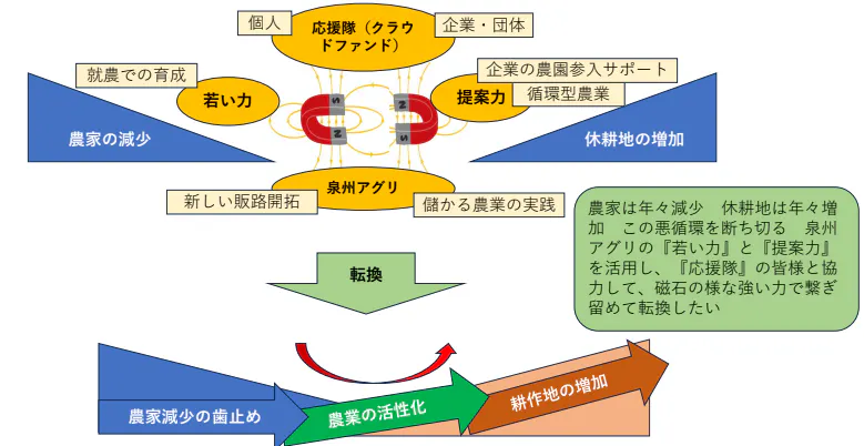 日本農業の3大課題である「担い手の発掘・育成、耕作放棄地の解消、地域の文化や特産品を通じた地域の活性化」に挑戦し続ける泉州アグリ。泉州農業、大阪農業の再生・活性化のために共に挑戦しましょう。