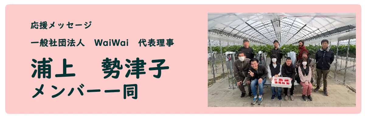 こんにちは 泉州泉南市でイチゴの栽培を行っているWaiWaiです。障がいを持ったメンバーと美味しいイチゴを育てています。泉州アグリさんには、企業でのマルシェで大変お世話になっています。今回、耕作放棄地の活性化のためクラウドファンディングを立ち上げられたことに感銘しています。地域の農業活性化のためにともに協力して行きたいと思っています。
