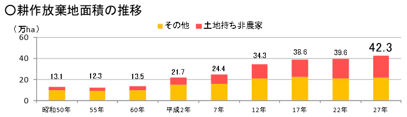 大阪府の経営耕地面積は2005年から2020年で約28%減少し減少しました。経営耕地面積は、農業経営を営む上で実際に使っている土地の面積を指します。逆に過去1年以上作付けされておらず、今後も作付けする意思のない土地を耕作放棄地と呼び、年々増加傾向にあります。耕作放棄地(主観ベース)の面積は、年々増加し平成27年には42万3千haとなっている。