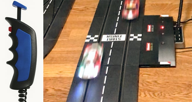 スロットカーとは、専用のスロット(溝)の上を電動で走るミニチュアカーです。操縦者はコントローラーを使って、電気の流れるレーンにマシンの速度を調整しながら走らせます。