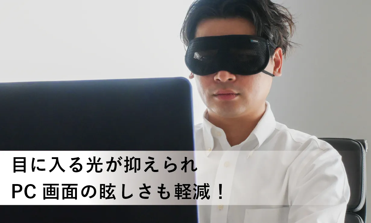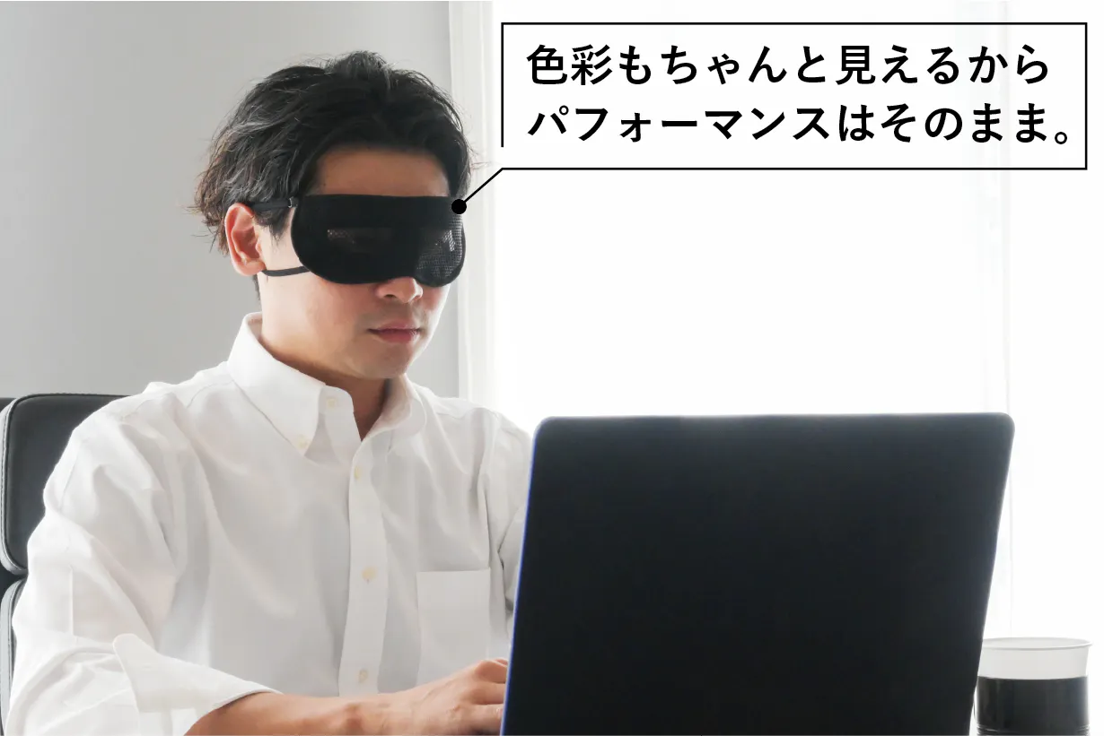 「メディカルサーモアイウォーマー」はブルーライトレンズとは異なり色彩までしっかりと見える状態なのでほぼ裸眼感覚。パソコンやスマホ画面上での色彩への違和感もなく作業への影響もありません。集中しすぎてた日の夕方や翌朝に残る目の疲れを感じている方に見えながら目を休めます。