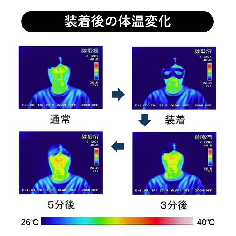 生地に肌が触れることで光を熱エネルギーに変換して蓄える蓄熱保温効果で、心地よい温度でじんわりと目の周りを温めます。表面上では感じにくい温かさですが、目の周辺は奥側ではしっかり温度上昇がうかがえることがわかります。