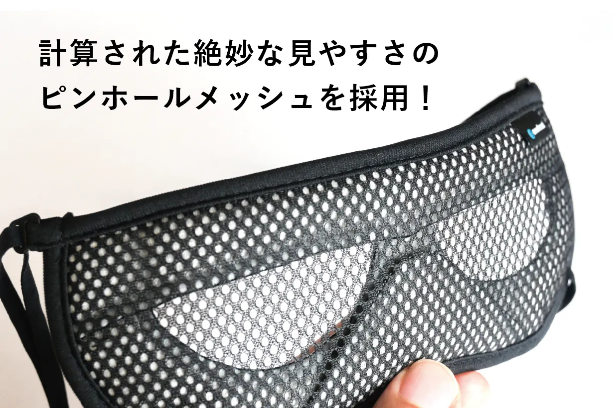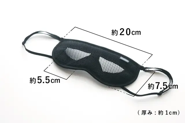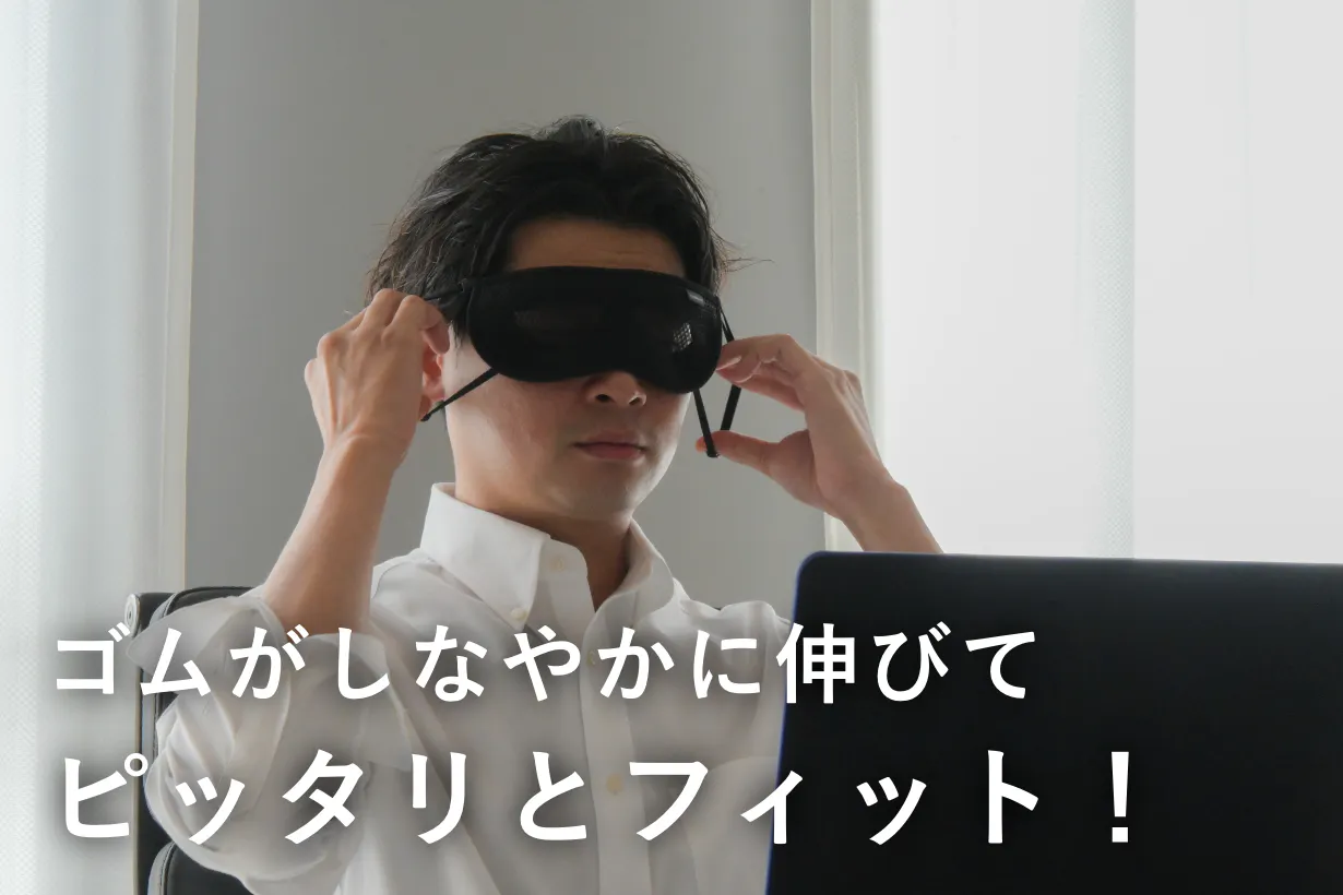 特殊な内部の立体構造と特殊な立体縫製で特許を出願。製法で一番苦労したのが瞬きの邪魔をしないこと。平面布地を3層に重ねることで完成したことで違和感なく装着できます。目の周辺に沿うように少し湾曲しやすくしたことも計算の一つ。弊社のこだわりはそんな見えないところも工夫しています。